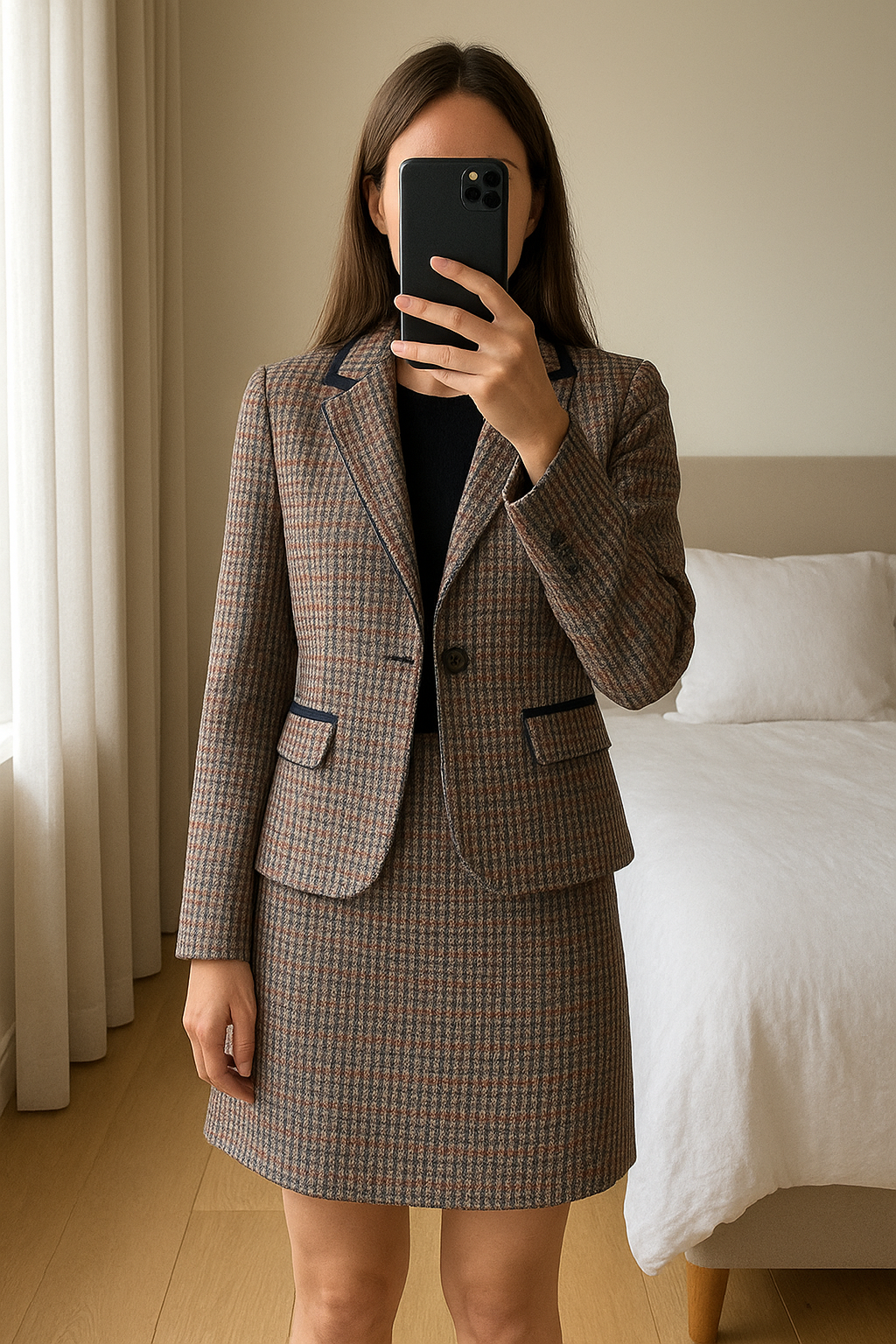Ensemble tailleur jupe Camaïeu debout, face à la caméra, dans une chambre à la lumière douce, avec une lumière naturelle filtrant par la fenêtre.