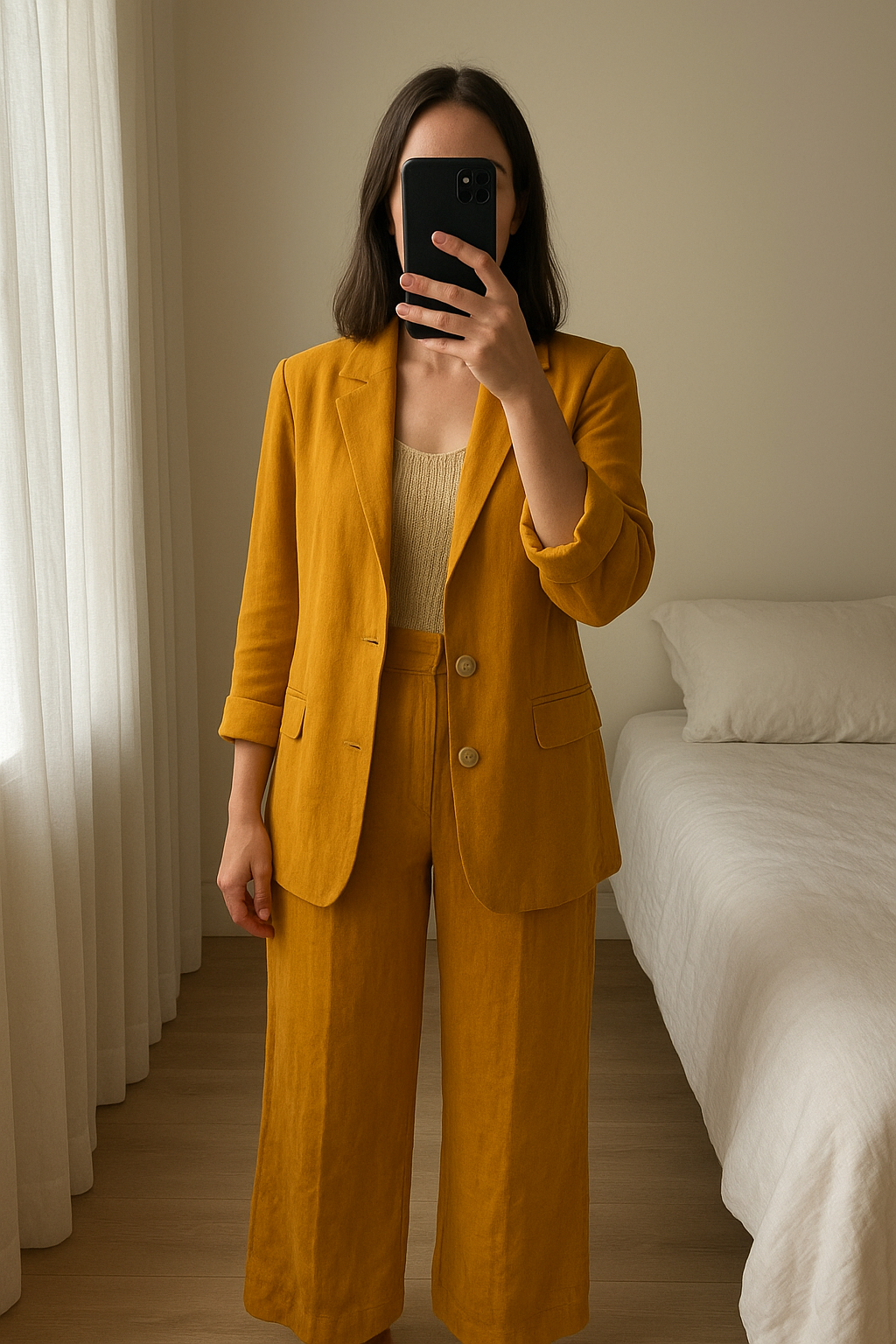 Ensemble tailleur neuf Kiabi taille 38 debout, face à la caméra, dans une chambre à la lumière douce, avec une lumière naturelle filtrant par la fenêtre.