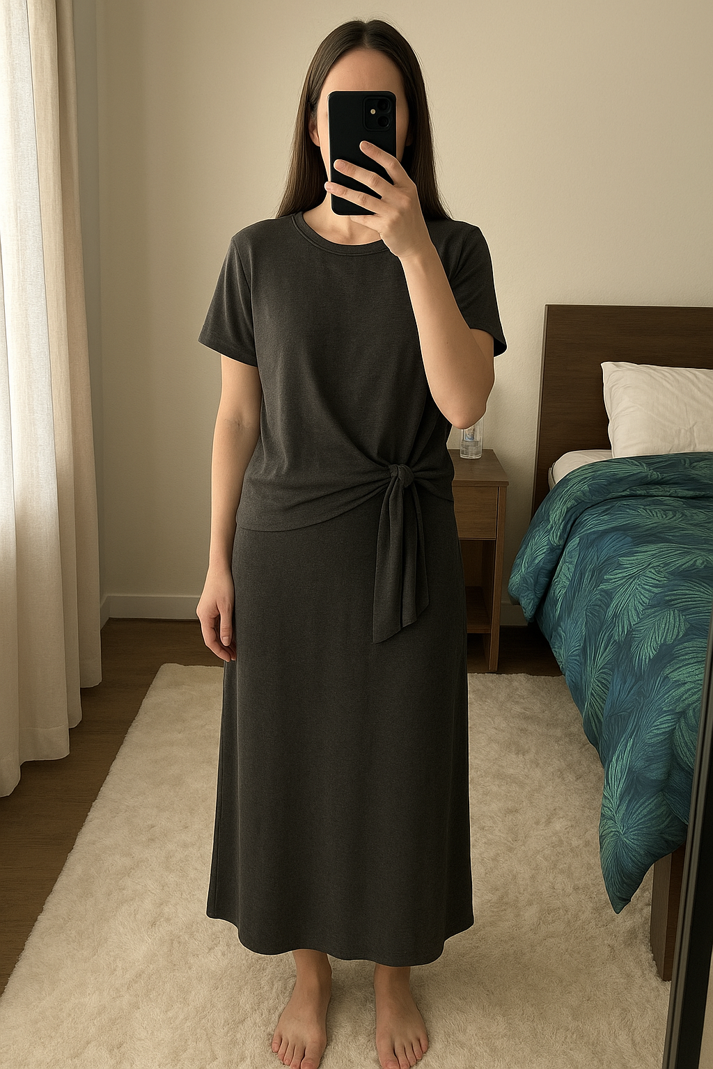Ensemble zara femme debout, face à la caméra, dans une chambre à la lumière douce, avec une lumière naturelle filtrant par la fenêtre.