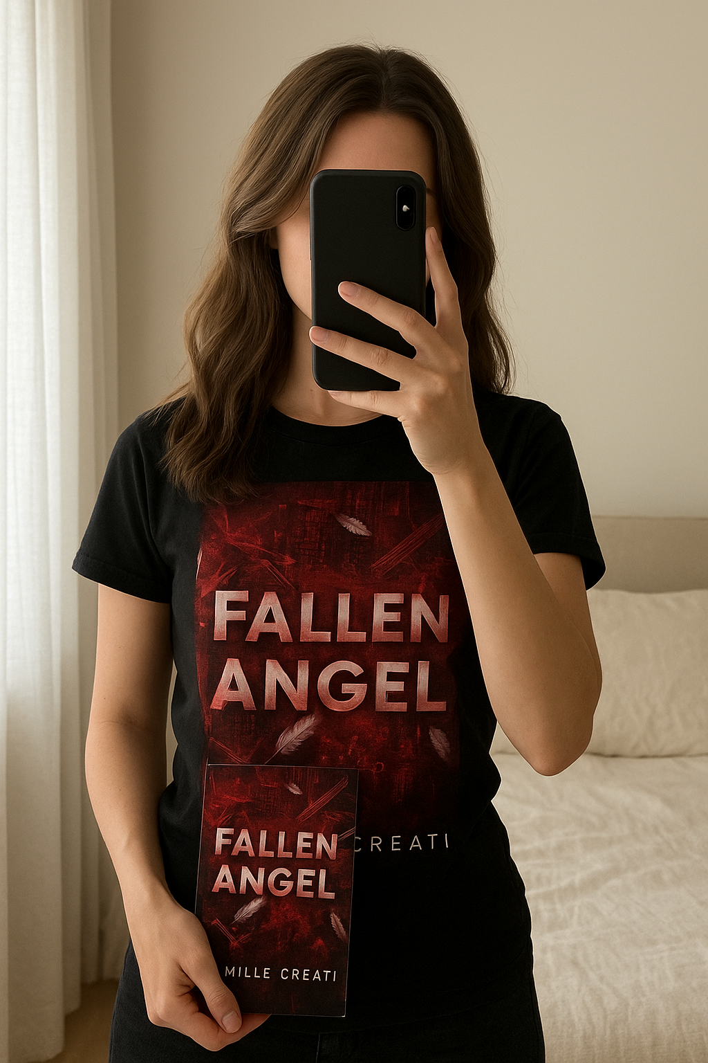 Fallen Angel - Camille Creati ( format broché) debout, face à la caméra, dans une chambre à la lumière douce, avec une lumière naturelle filtrant par la fenêtre.