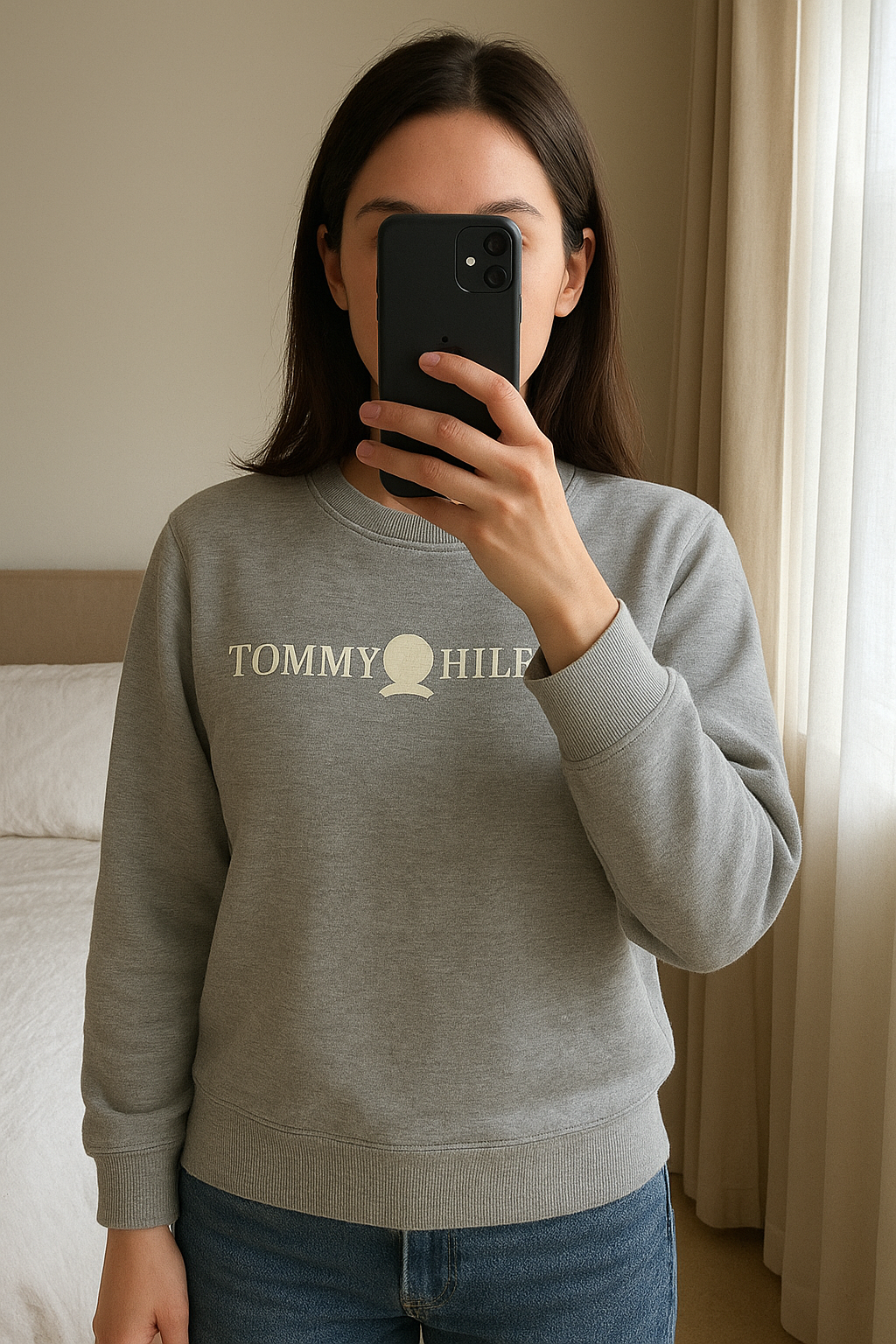 Felpa Tommy Hilfiger Originale taglia M in piedi, rivolto verso la fotocamera, in una camera da letto con luce soffusa e luce naturale che filtra dalla finestra.
