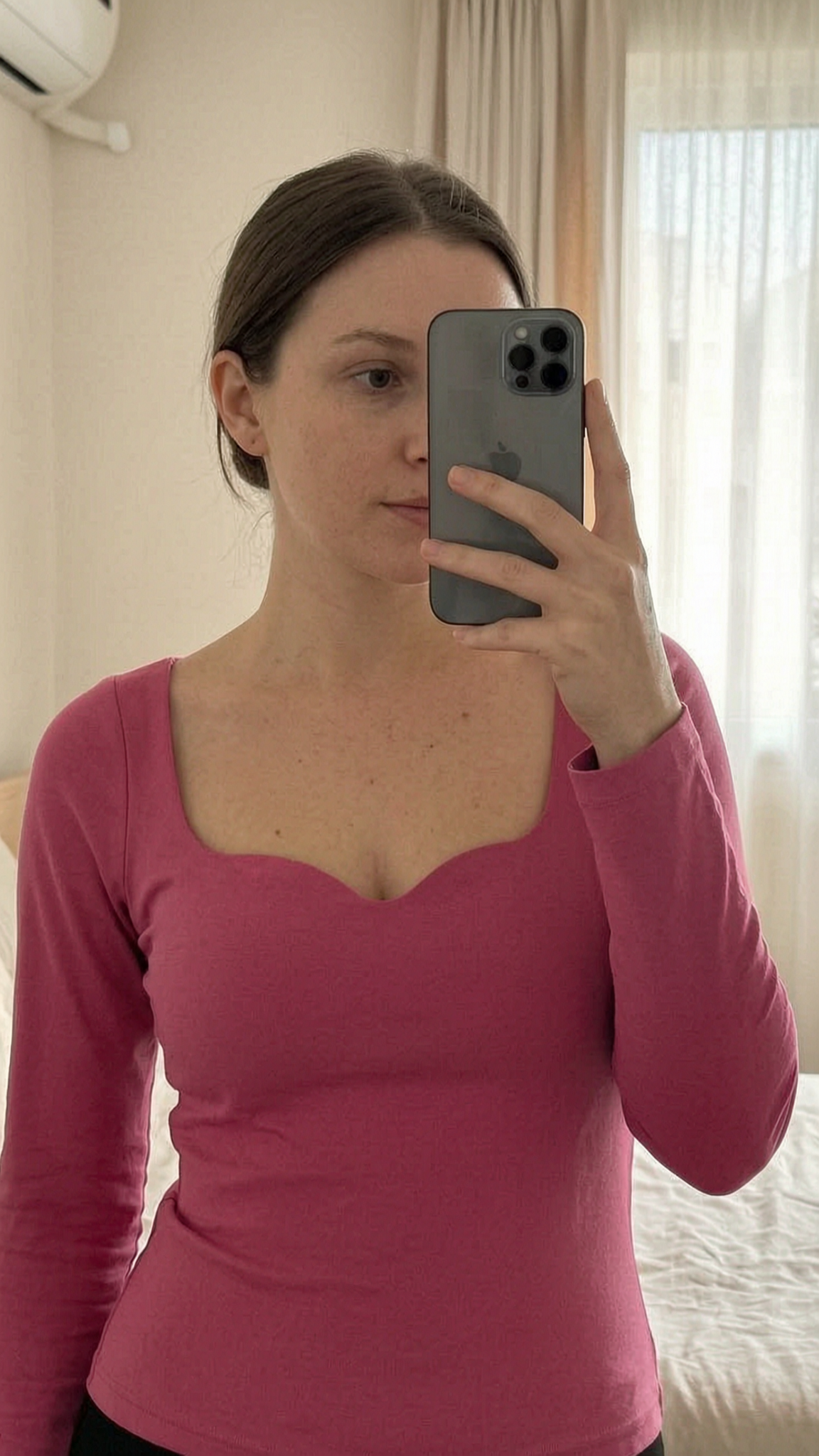 Figurbetontes Jersey-Shirt - Gr. S - H&M aufrecht stehend, der Kamera zugewandt, in einem sanft beleuchteten Schlafzimmer, mit natürlichem Licht, das durch ein Fenster fällt.