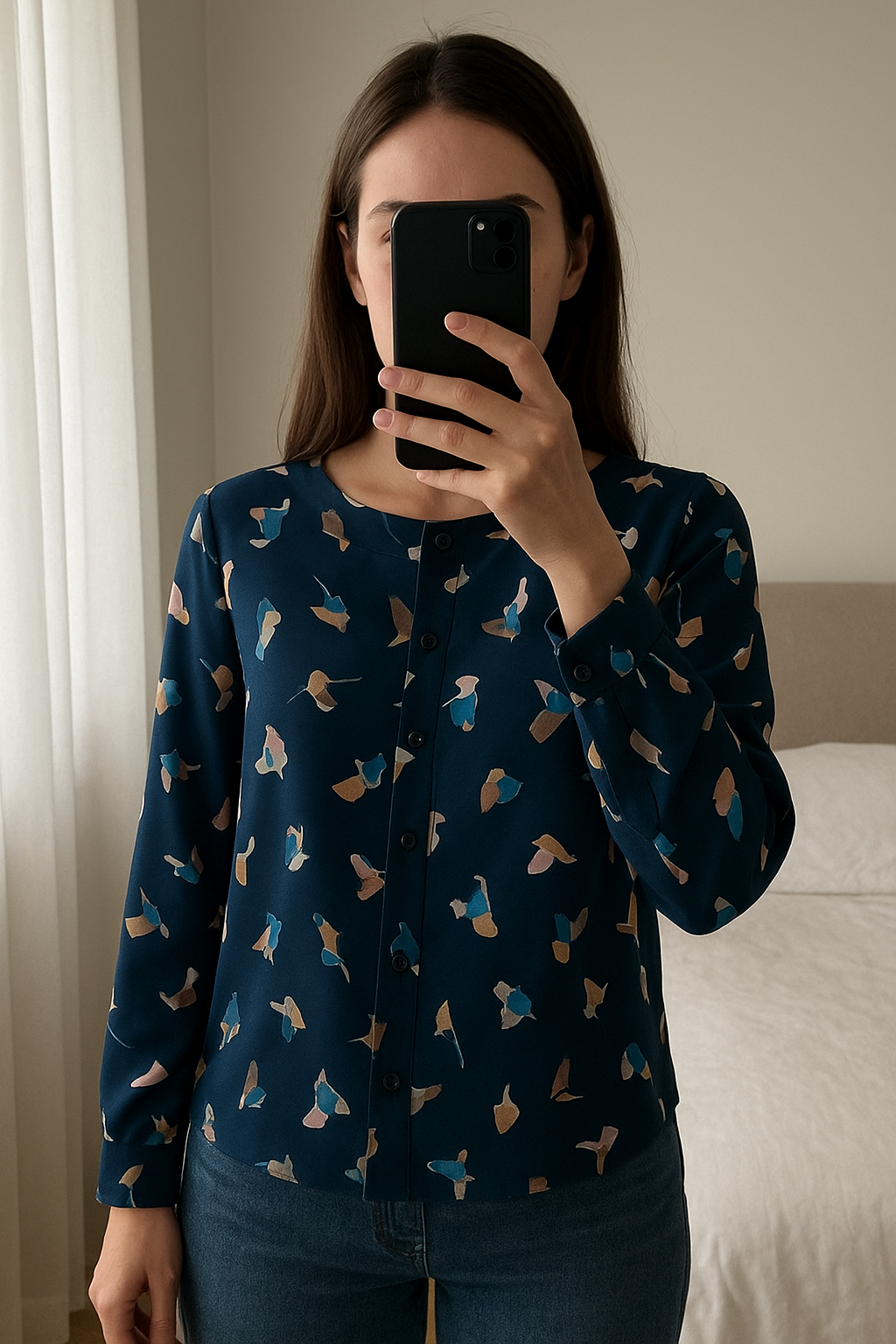 Fleurige blouse - Hampton Bays - Maar 36 (valt ruim) - als nieuw debout, face à la caméra, dans une chambre à la lumière douce, avec une lumière naturelle filtrant par la fenêtre.