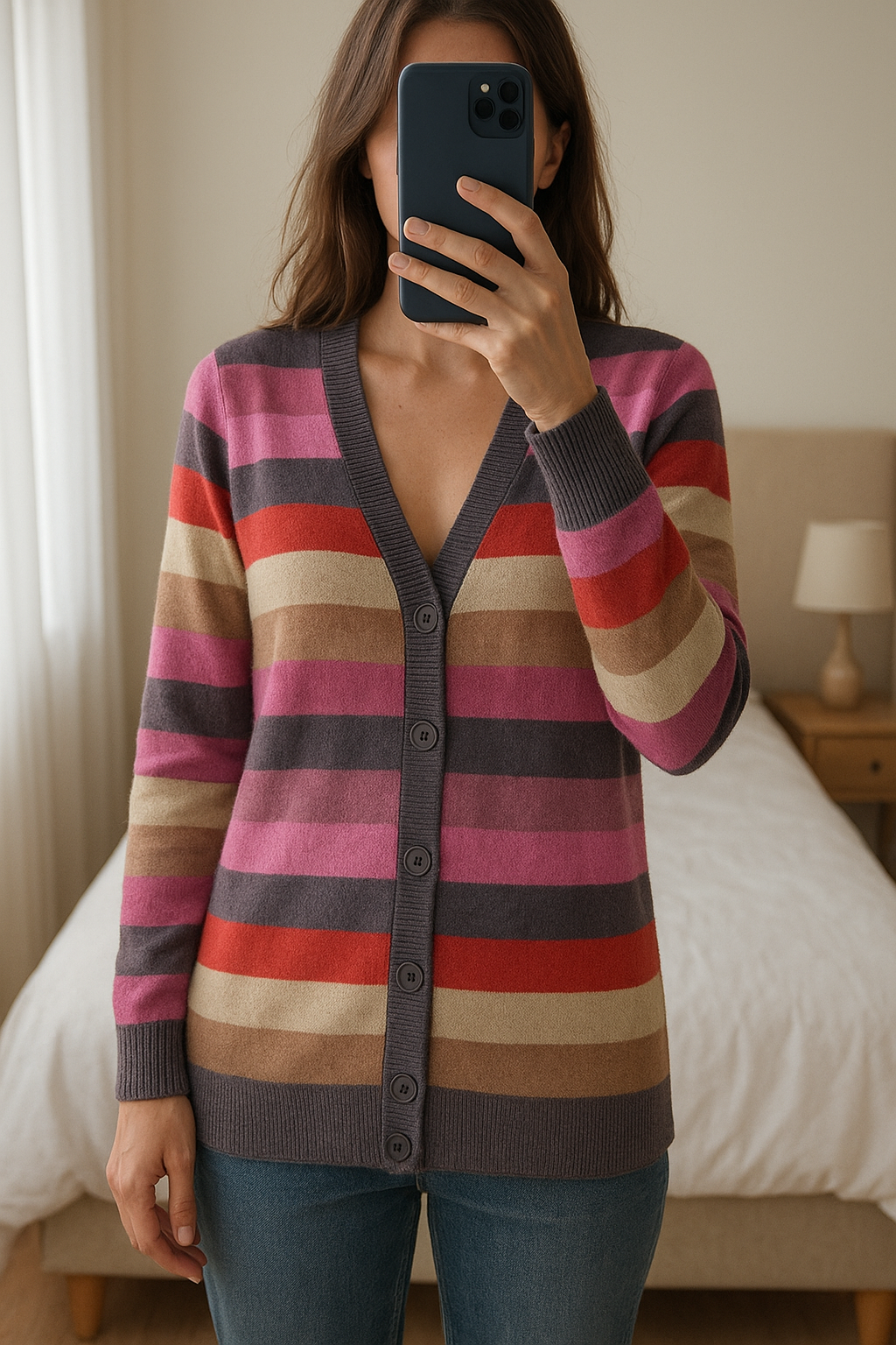 Fleurige gekleurde vest - GAP - maat S - goed standing straight facing the camera, in a softly lit bedroom setting, with gentle natural light filtering through a window.