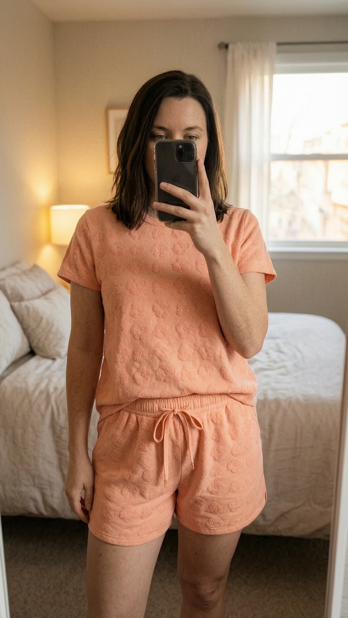 Frottee Set aufrecht stehend, der Kamera zugewandt, in einem sanft beleuchteten Schlafzimmer, mit natürlichem Licht, das durch ein Fenster fällt.
