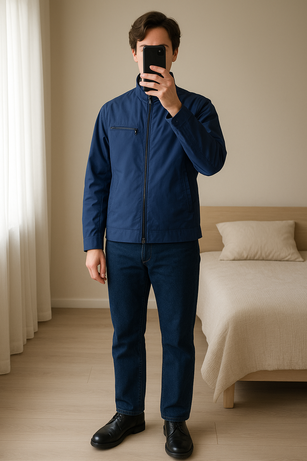 Geacă BLEU în stil casual sport, mărimea M / BLUE lightweight sporty casual jacket, size M standing straight facing the camera, in a softly lit bedroom setting, with gentle natural light filtering through a window.