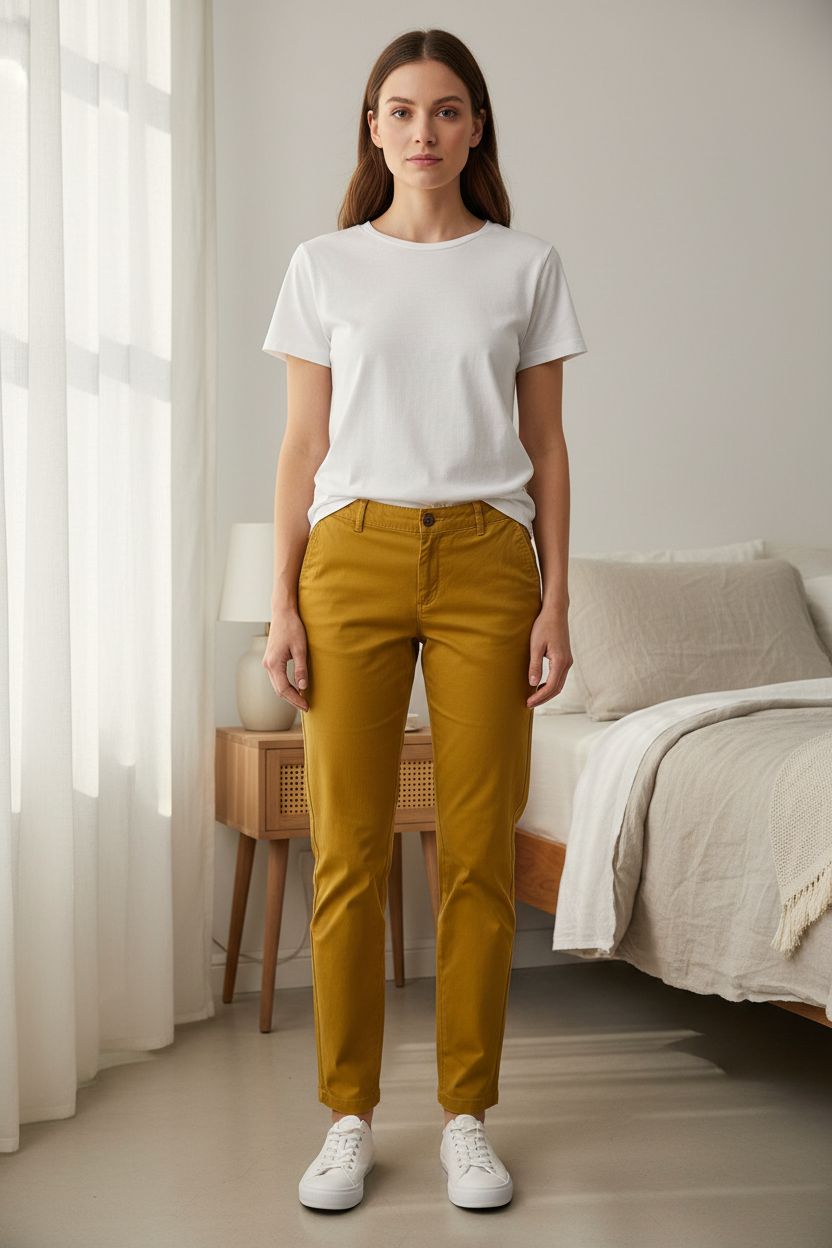 Gelbe Chino Hose Sommerhose Gr. 40 (L) Amazon Essentials aufrecht stehend, der Kamera zugewandt, in einem sanft beleuchteten Schlafzimmer, mit natürlichem Licht, das durch ein Fenster fällt.