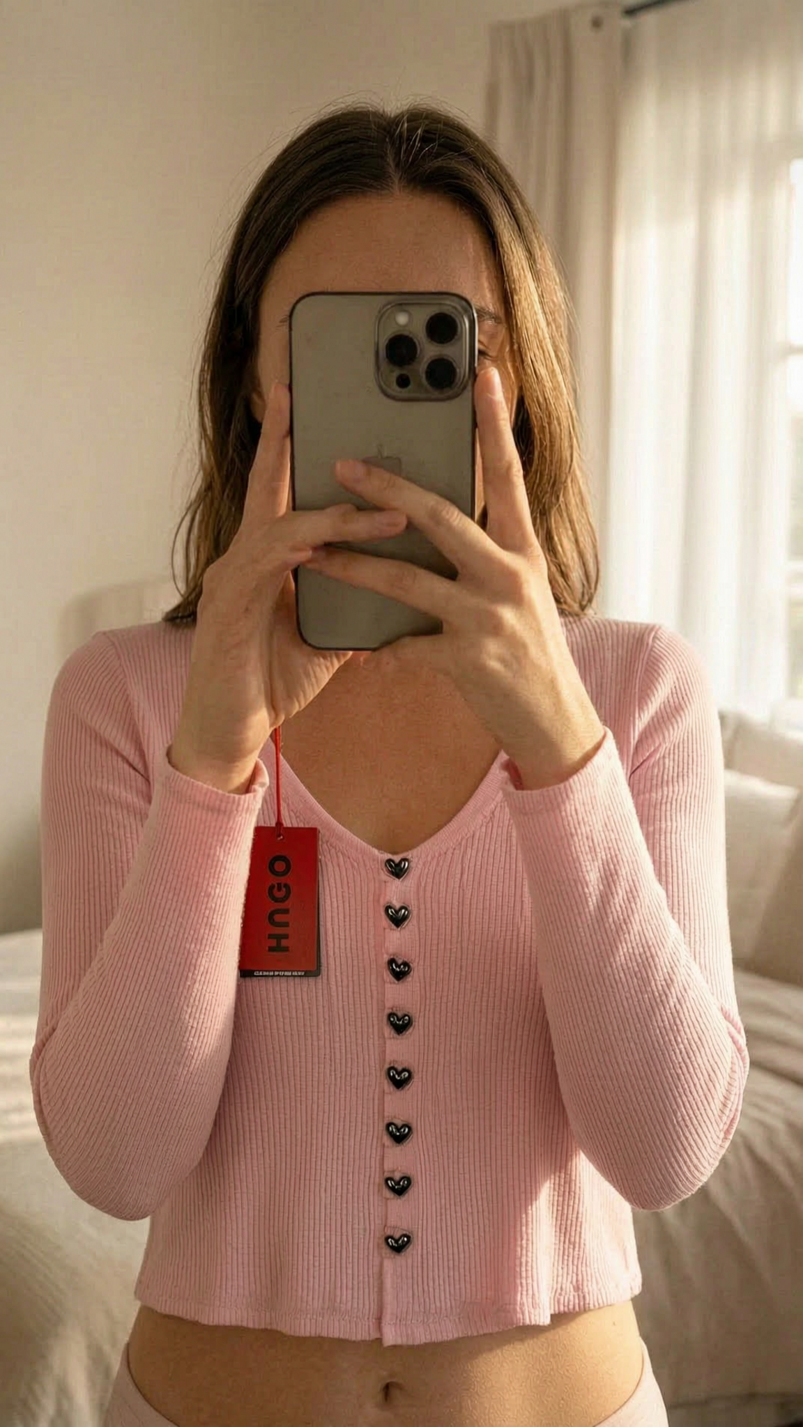 Gerippter cropped Cardigan mit herzförmiger Knopfleiste - Gr. S - Hugo aufrecht stehend, der Kamera zugewandt, in einem sanft beleuchteten Schlafzimmer, mit natürlichem Licht, das durch ein Fenster fällt.