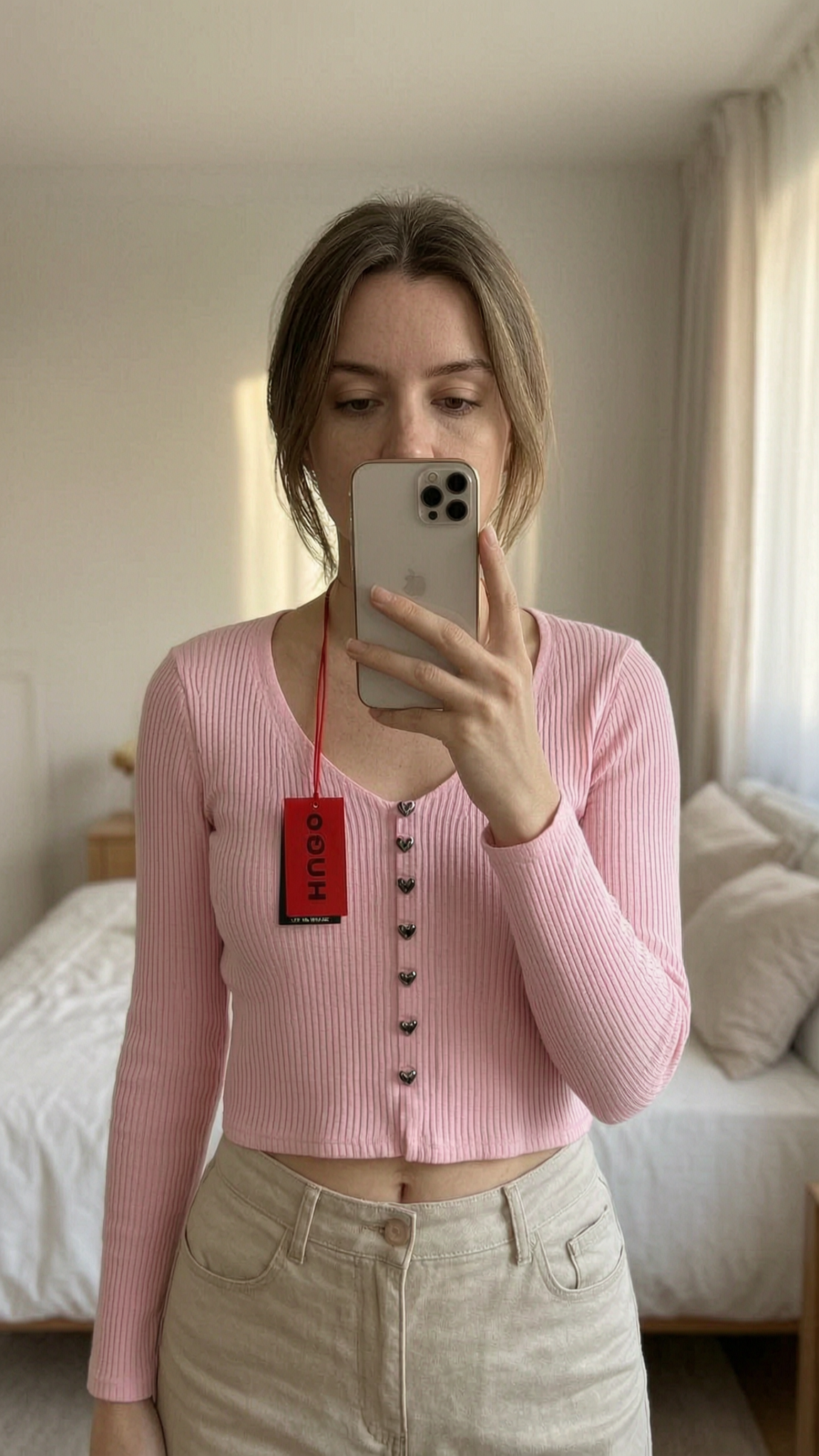 Gerippter cropped Cardigan mit herzförmiger Knopfleiste - Gr. S - Hugo aufrecht stehend, der Kamera zugewandt, in einem sanft beleuchteten Schlafzimmer, mit natürlichem Licht, das durch ein Fenster fällt.