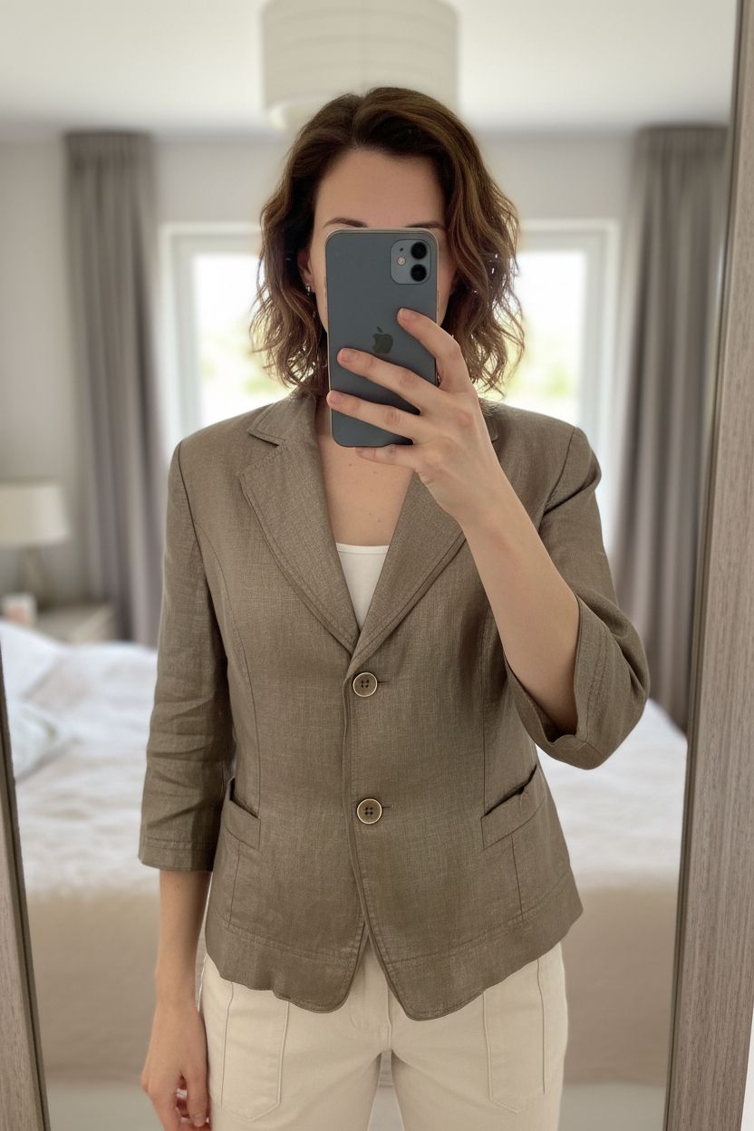 Gerry Weber Blazer Leinen Metallic Beige Braun Gr. 40 tailliert 3/4 Arm aufrecht stehend, der Kamera zugewandt, in einem sanft beleuchteten Schlafzimmer, mit natürlichem Licht, das durch ein Fenster fällt.