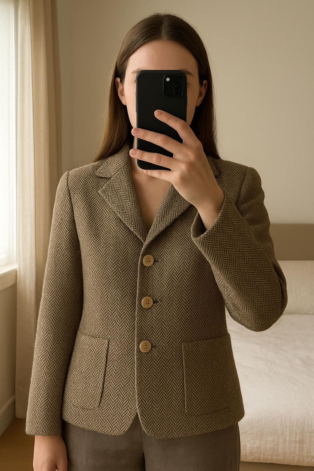 Giacca blazer tweed spigato marrone Lana Italia XS/S🧥 in piedi, rivolto verso la fotocamera, in una camera da letto con luce soffusa e luce naturale che filtra dalla finestra.