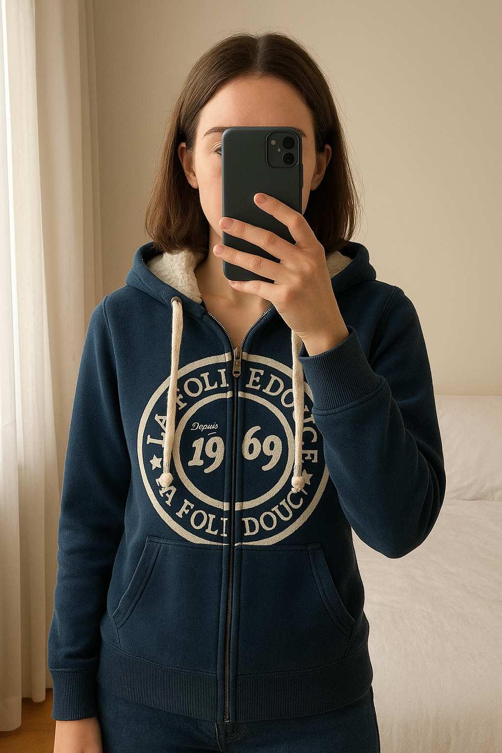 Gilet chaud à capuche la folie douce debout, face à la caméra, dans une chambre à la lumière douce, avec une lumière naturelle filtrant par la fenêtre.
