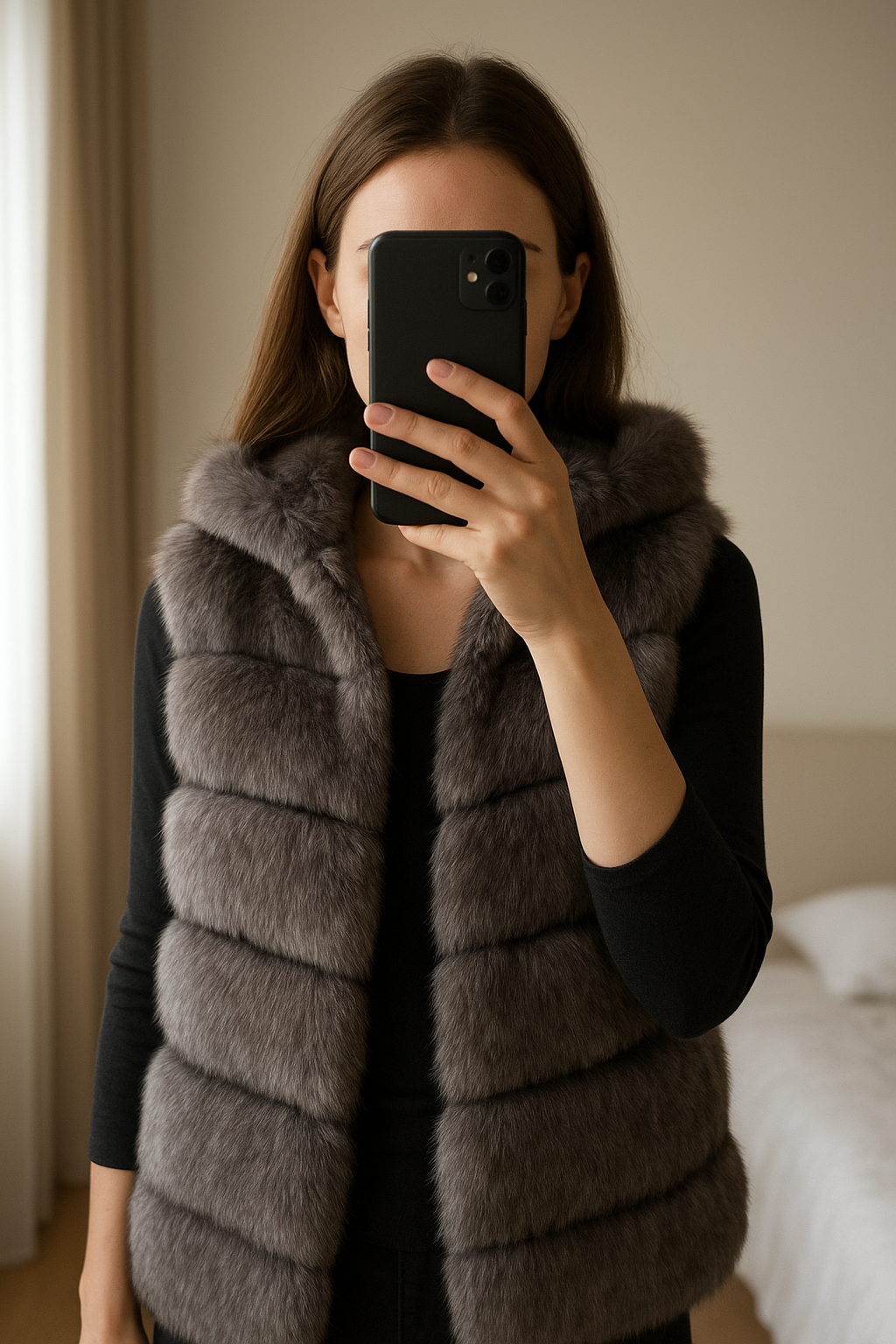 Gilet fausse fourrure long sans manche gris debout, face à la caméra, dans une chambre à la lumière douce, avec une lumière naturelle filtrant par la fenêtre.