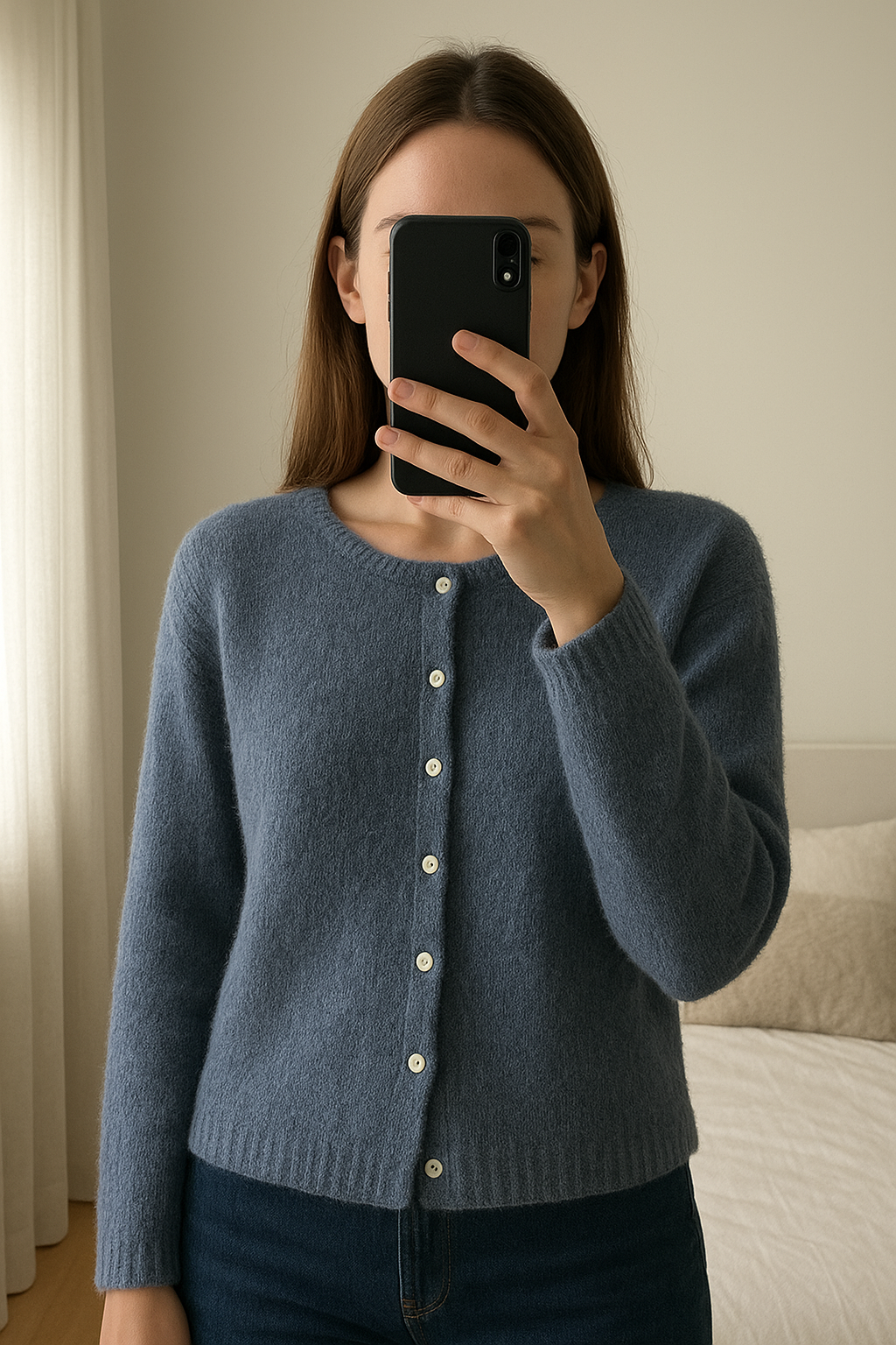 Gilet Gaspard Sézane femme S – Bleu vintage, chaud et élégant debout, face à la caméra, dans une chambre à la lumière douce, avec une lumière naturelle filtrant par la fenêtre.