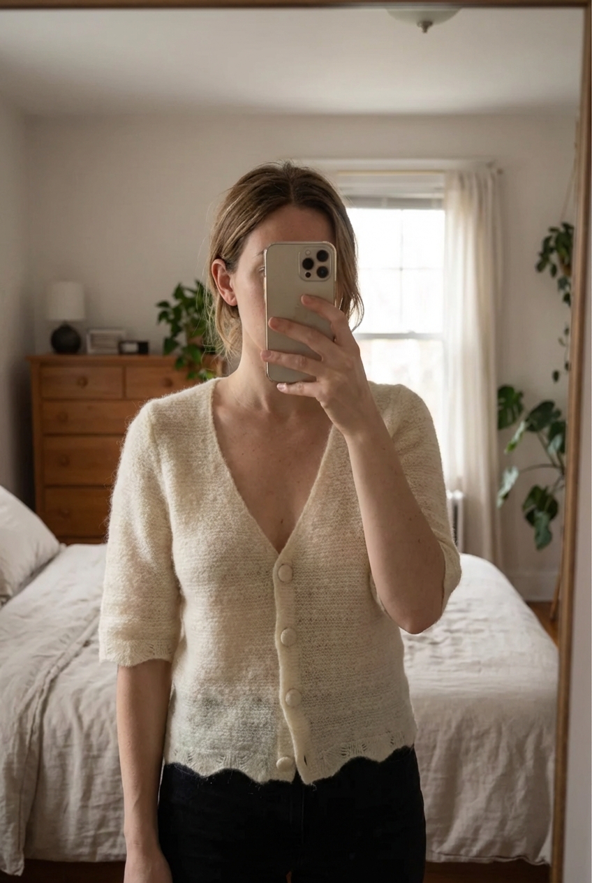 Gilet Lilou écru Sézane debout, face à la caméra, dans une chambre à la lumière douce, avec une lumière naturelle filtrant par la fenêtre.