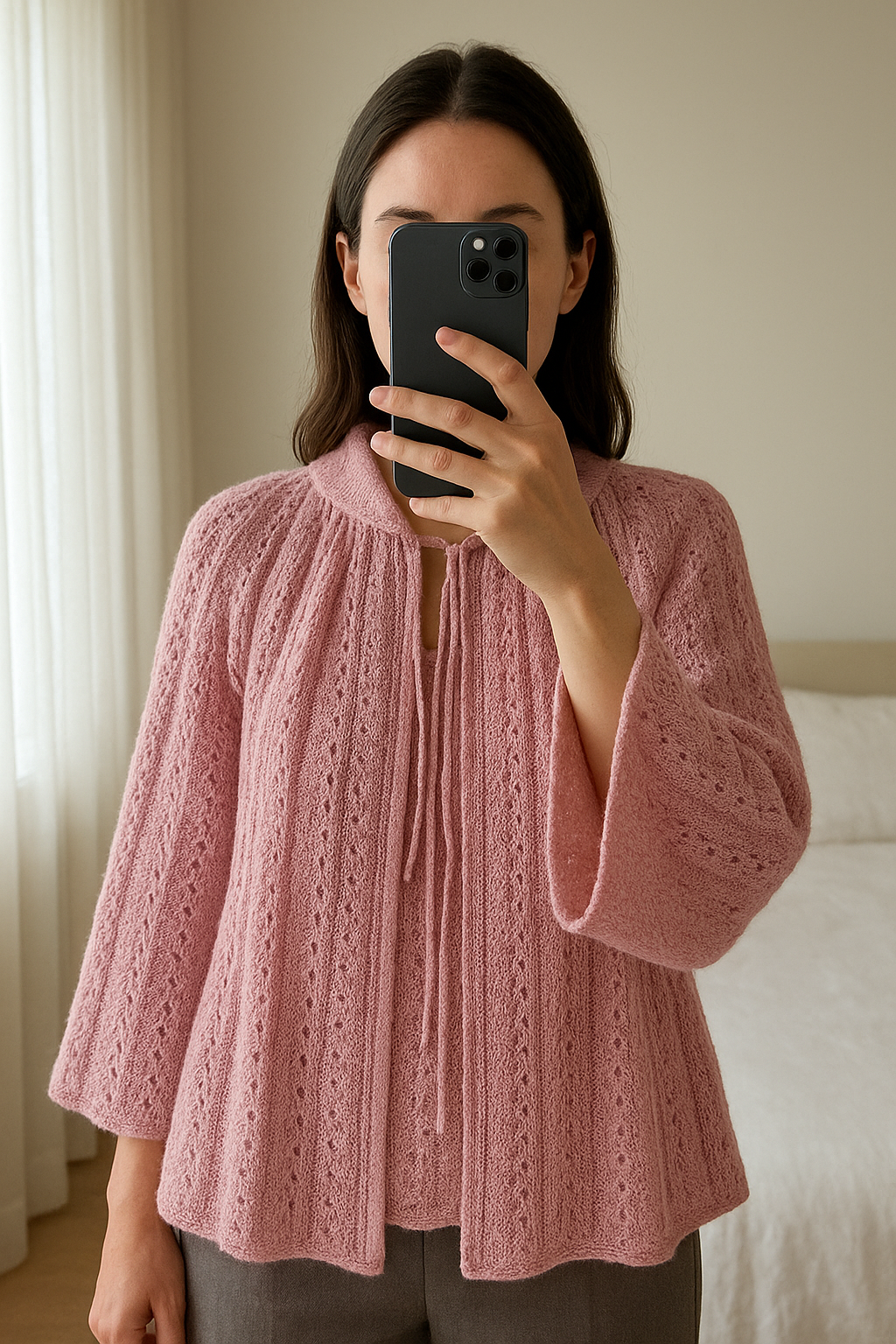 Gilet Liseuse Maille Rose manches 3/4 made in France 46 debout, face à la caméra, dans une chambre à la lumière douce, avec une lumière naturelle filtrant par la fenêtre.