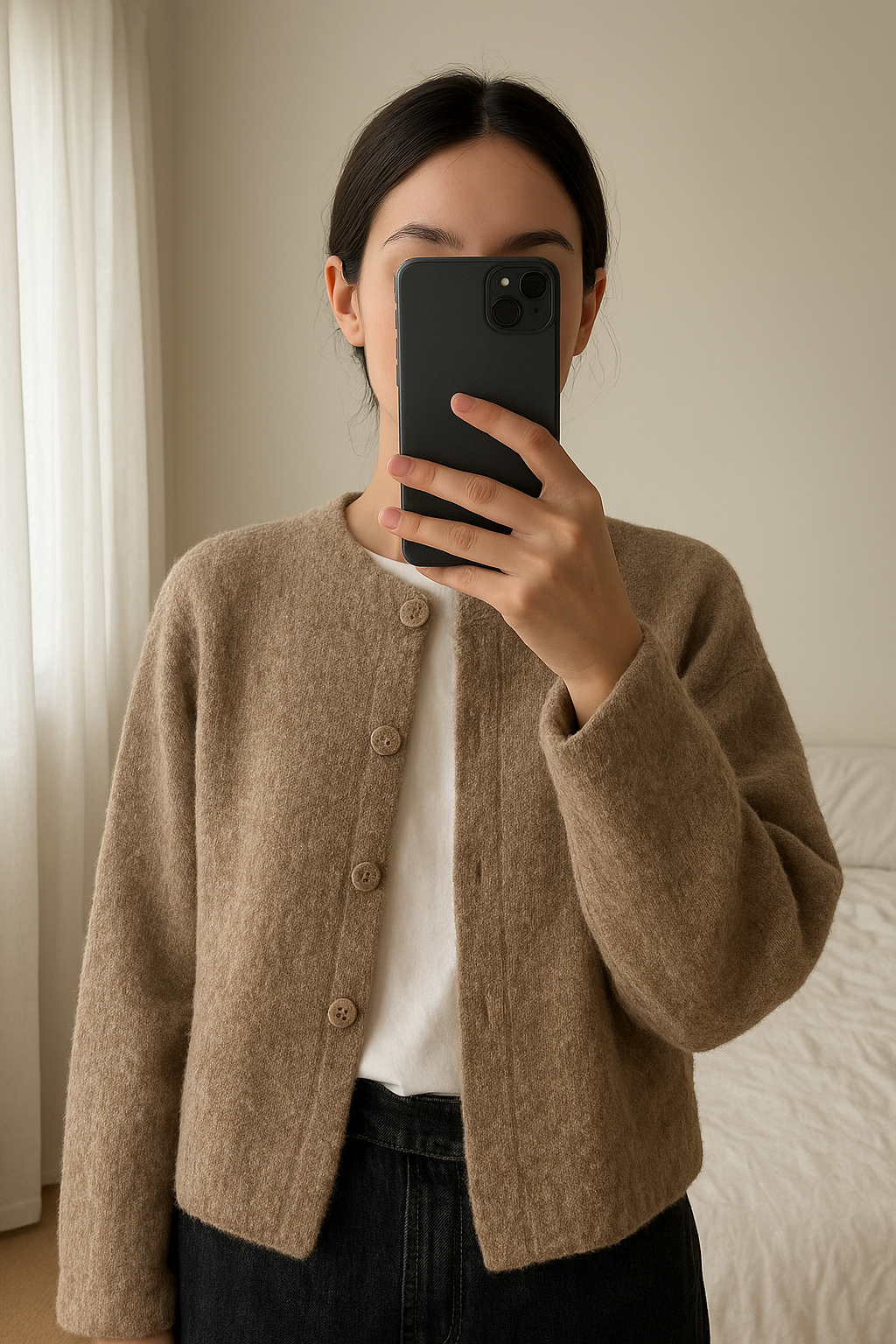 🤎 Gilet marron en maille debout, face à la caméra, dans une chambre à la lumière douce, avec une lumière naturelle filtrant par la fenêtre.