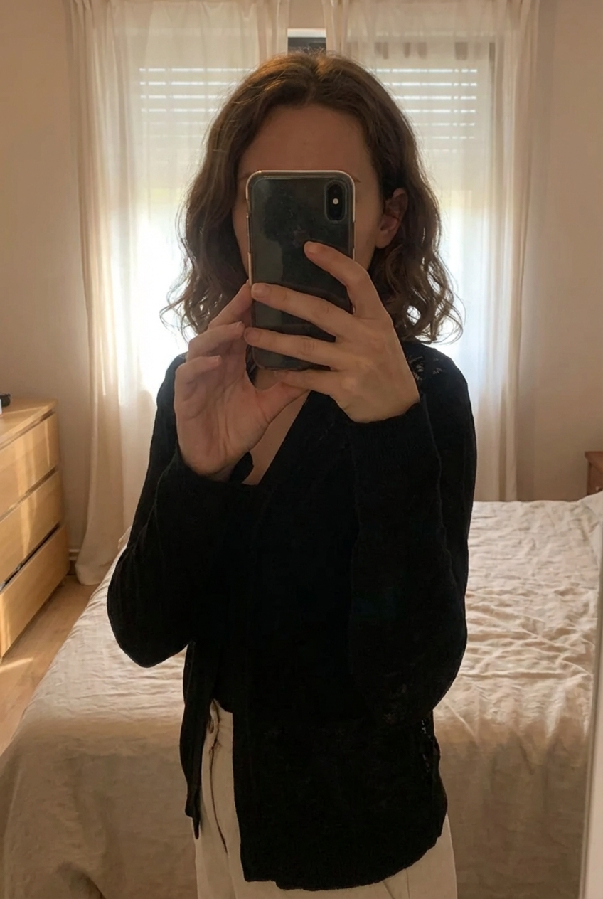 Gilet noir dos dentelle M debout, face à la caméra, dans une chambre à la lumière douce, avec une lumière naturelle filtrant par la fenêtre.
