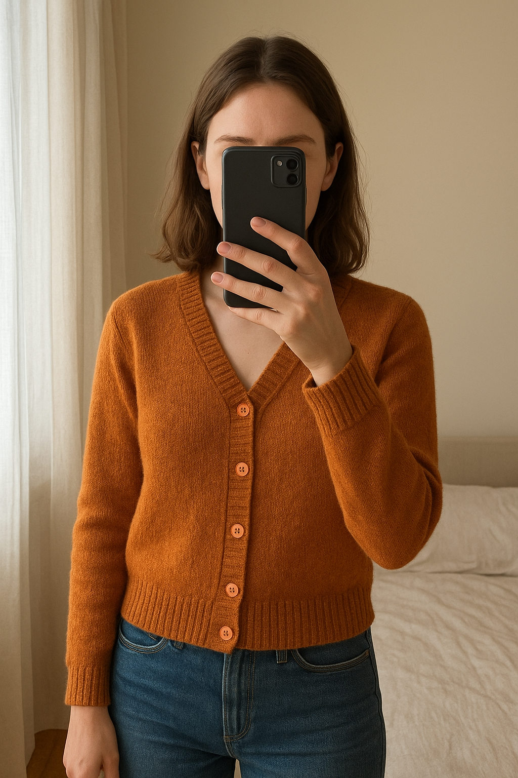 Gilet orange Des petits hauts debout, face à la caméra, dans une chambre à la lumière douce, avec une lumière naturelle filtrant par la fenêtre.
