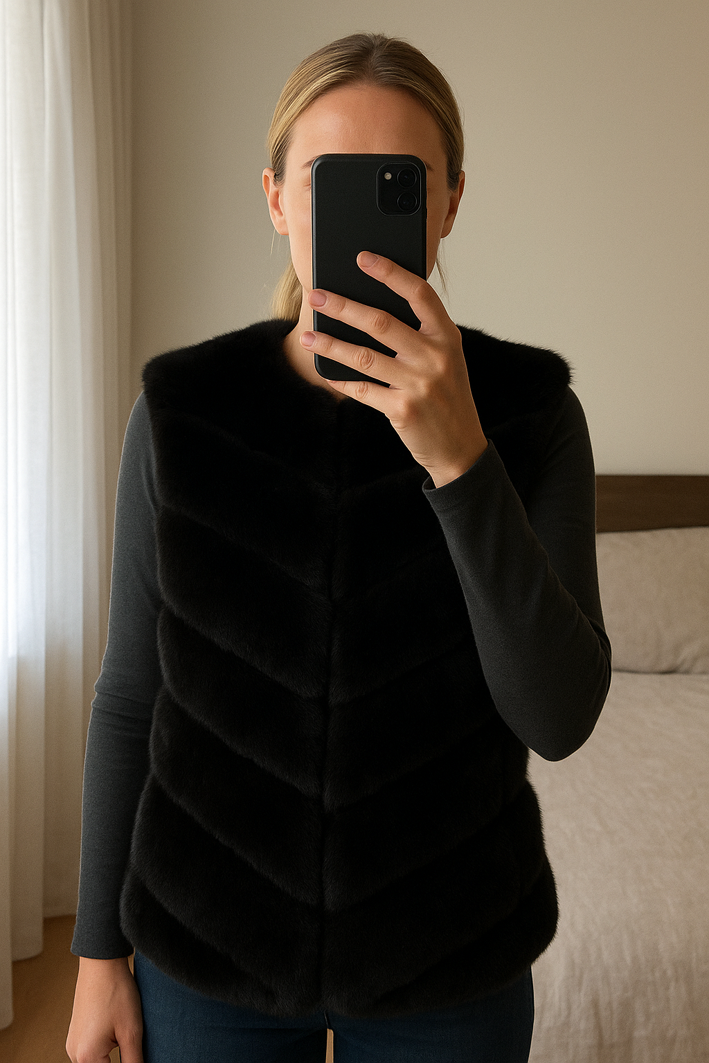 Gilet sans manche debout, face à la caméra, dans une chambre à la lumière douce, avec une lumière naturelle filtrant par la fenêtre.