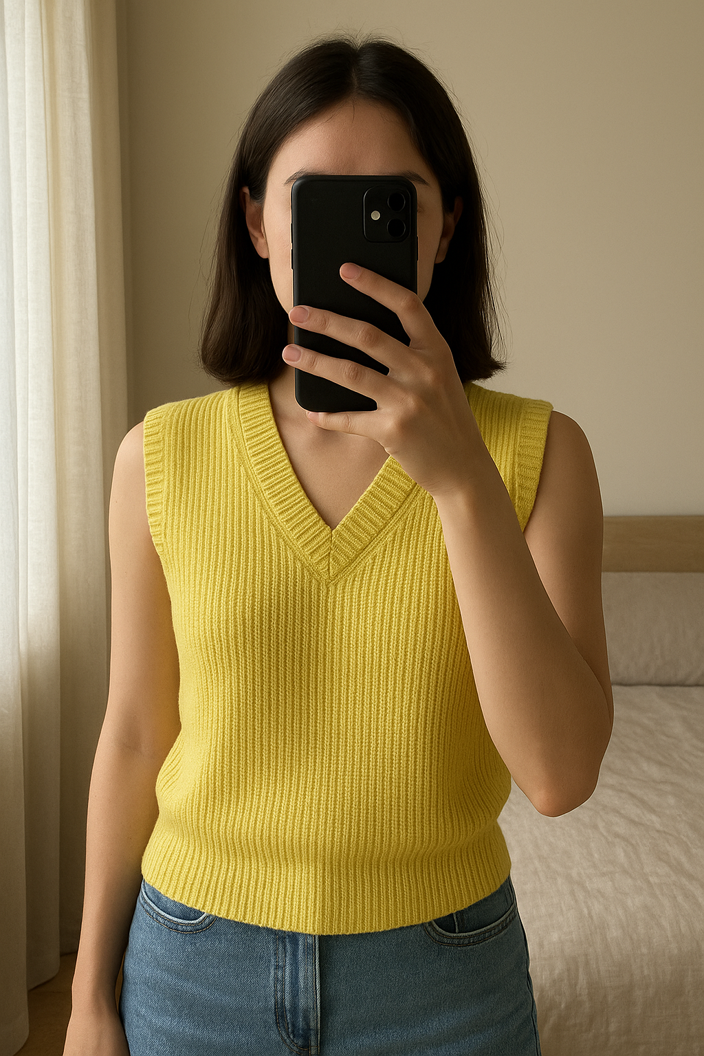 Gilet sans manche Zara debout, face à la caméra, dans une chambre à la lumière douce, avec une lumière naturelle filtrant par la fenêtre.