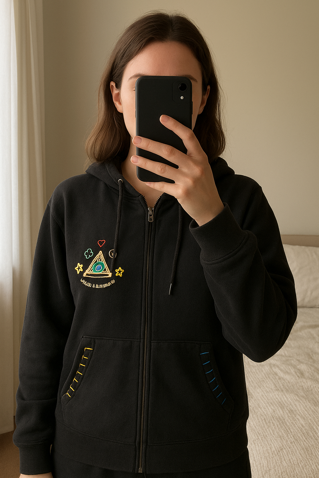 gilet zippé Elevenparis taille 16 ans debout, face à la caméra, dans une chambre à la lumière douce, avec une lumière naturelle filtrant par la fenêtre.