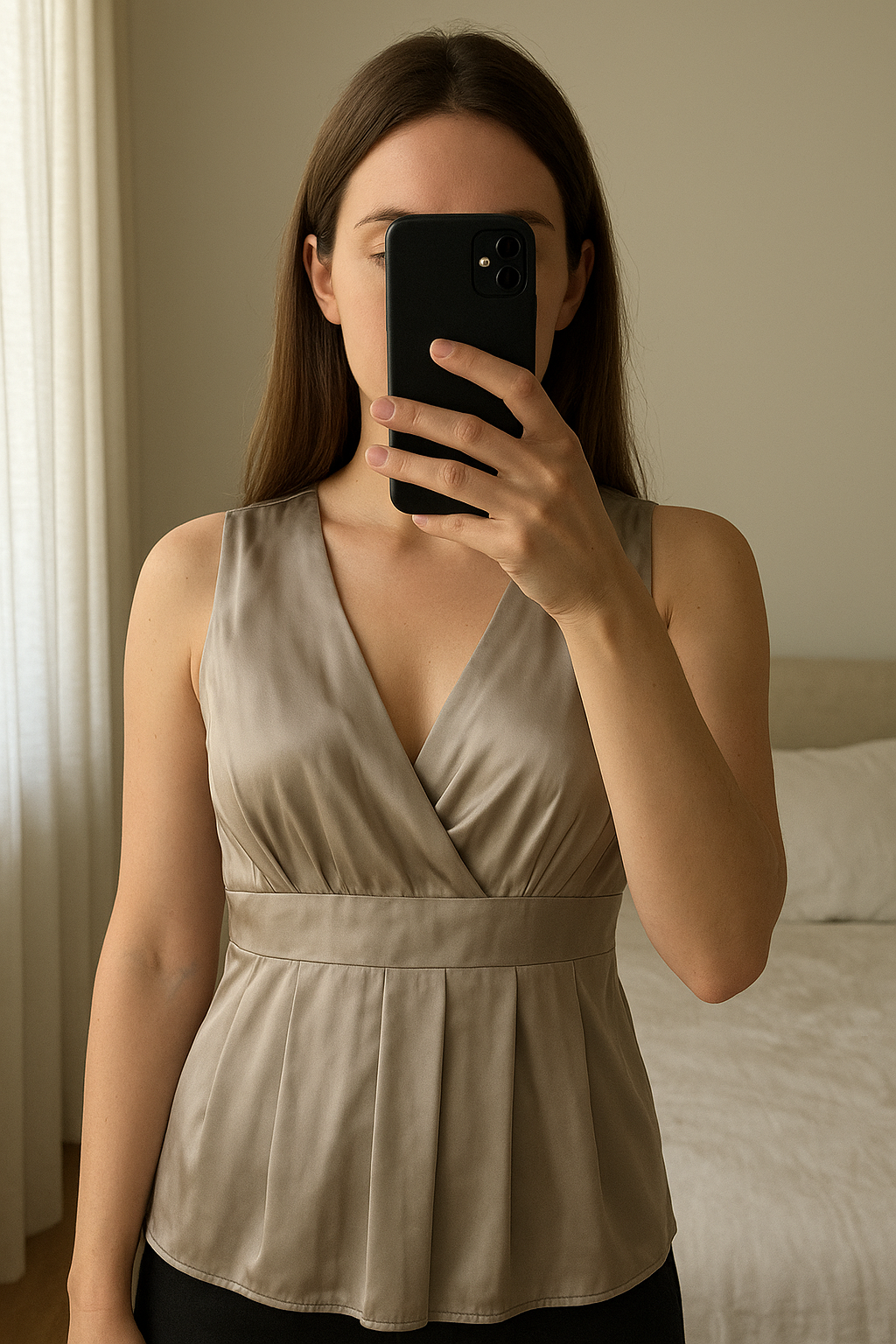 Gloednieuwe Zijde top - Xandres - maat 38 debout, face à la caméra, dans une chambre à la lumière douce, avec une lumière naturelle filtrant par la fenêtre.