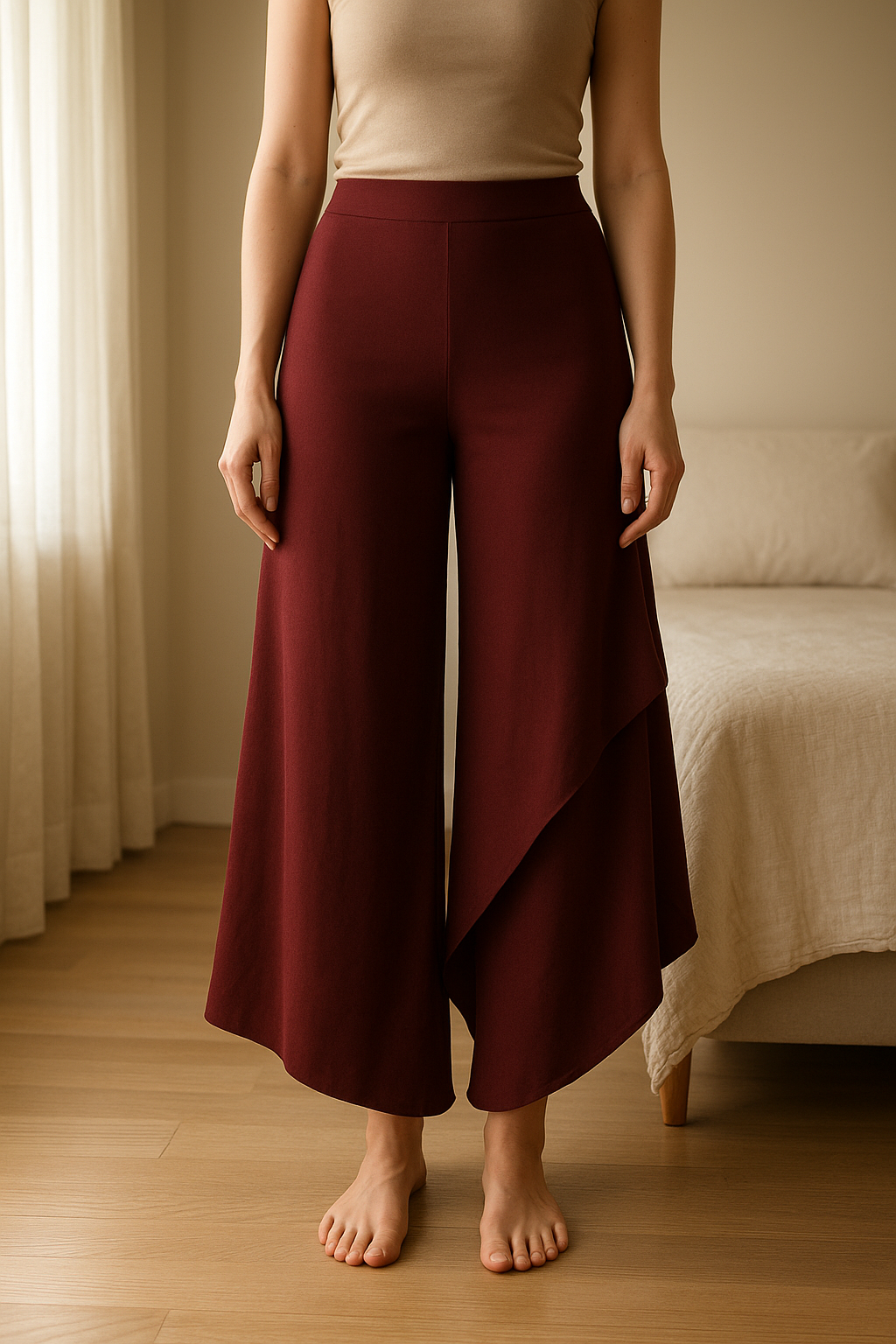 Gonna lunga asimmetrica in piedi, rivolto verso la fotocamera, in una camera da letto con luce soffusa e luce naturale che filtra dalla finestra.
