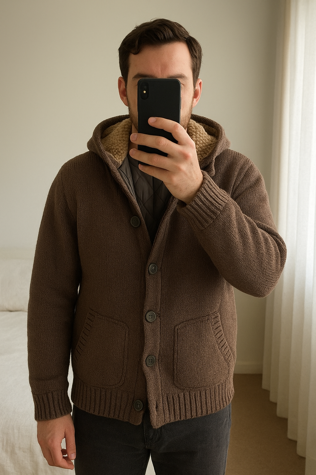Gros gilet veste homme cargo taille L debout, face à la caméra, dans une chambre à la lumière douce, avec une lumière naturelle filtrant par la fenêtre.