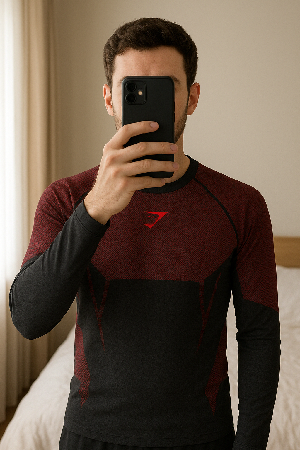 Gymshark Onyx 5.0 Seamless Long Sleeve Black/Carmine Red S aufrecht stehend, der Kamera zugewandt, in einem sanft beleuchteten Schlafzimmer, mit natürlichem Licht, das durch ein Fenster fällt.