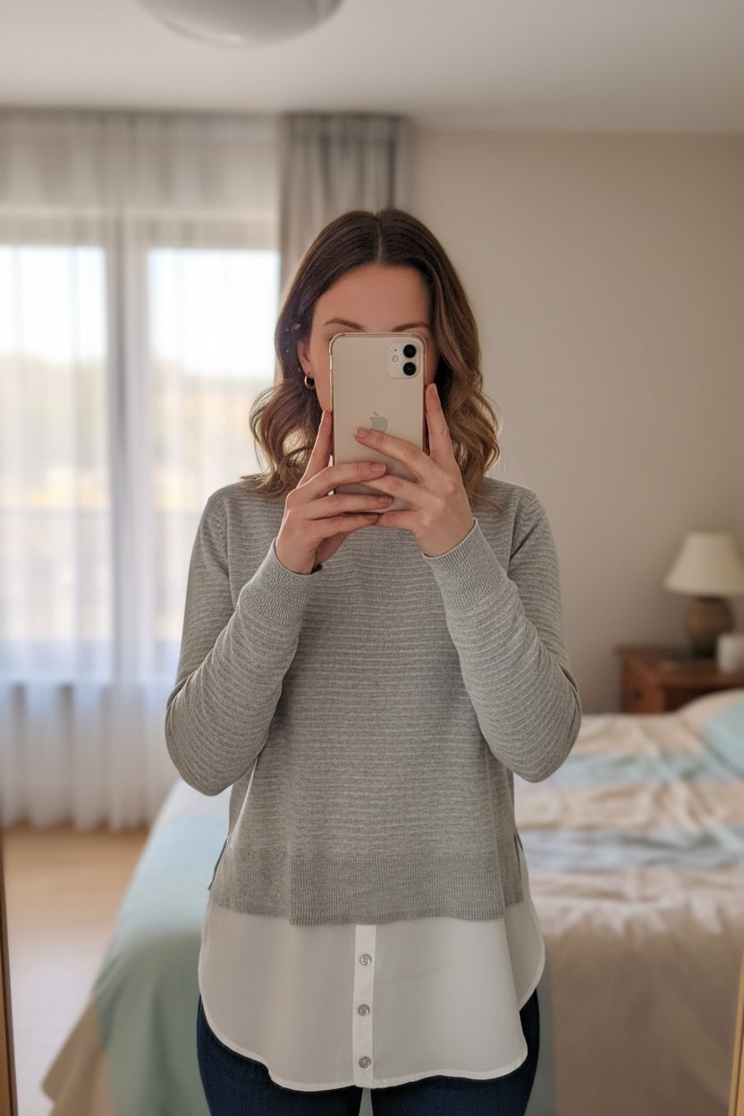 H&M Pullover mit Hemdkragen grau – Gr. M aufrecht stehend, der Kamera zugewandt, in einem sanft beleuchteten Schlafzimmer, mit natürlichem Licht, das durch ein Fenster fällt.