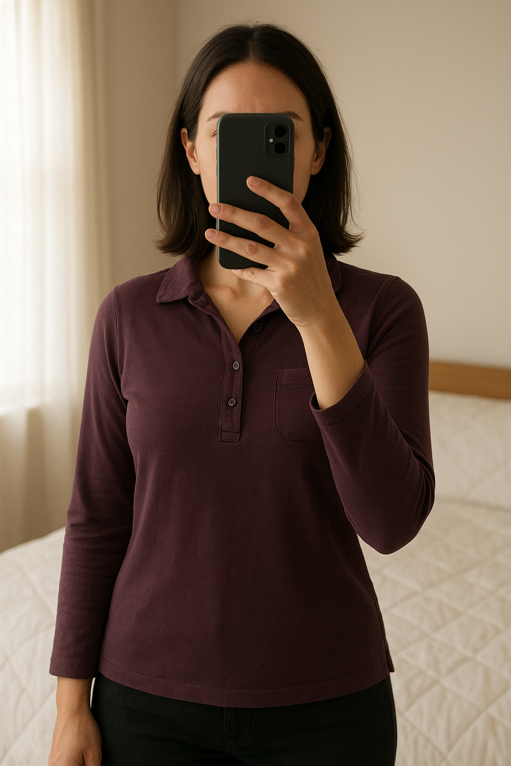 haut basic violet manches 3/4 taille XL debout, face à la caméra, dans une chambre à la lumière douce, avec une lumière naturelle filtrant par la fenêtre.