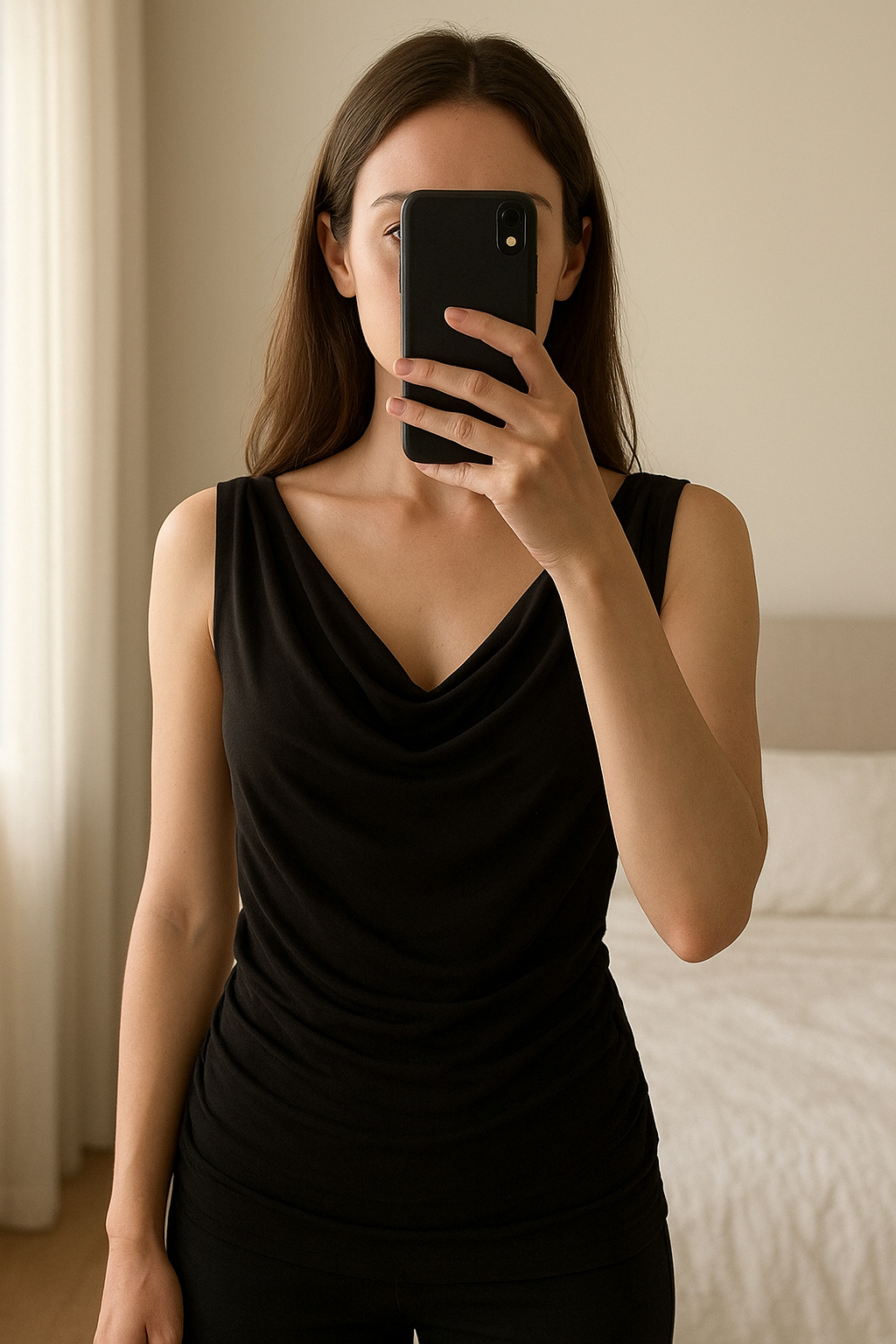 Haut de soirée noir classe debout, face à la caméra, dans une chambre à la lumière douce, avec une lumière naturelle filtrant par la fenêtre.