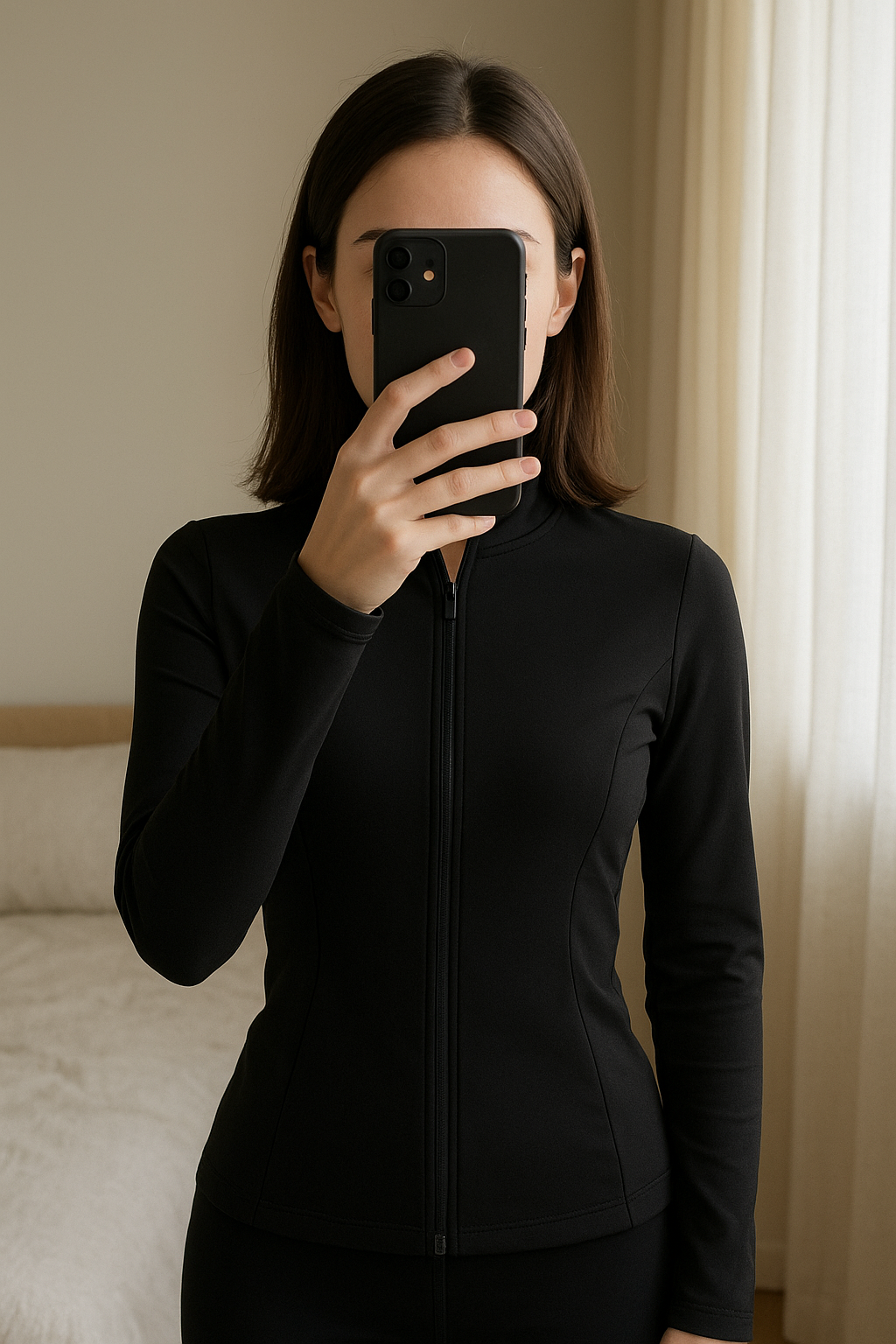 Haut de sport noir debout, face à la caméra, dans une chambre à la lumière douce, avec une lumière naturelle filtrant par la fenêtre.