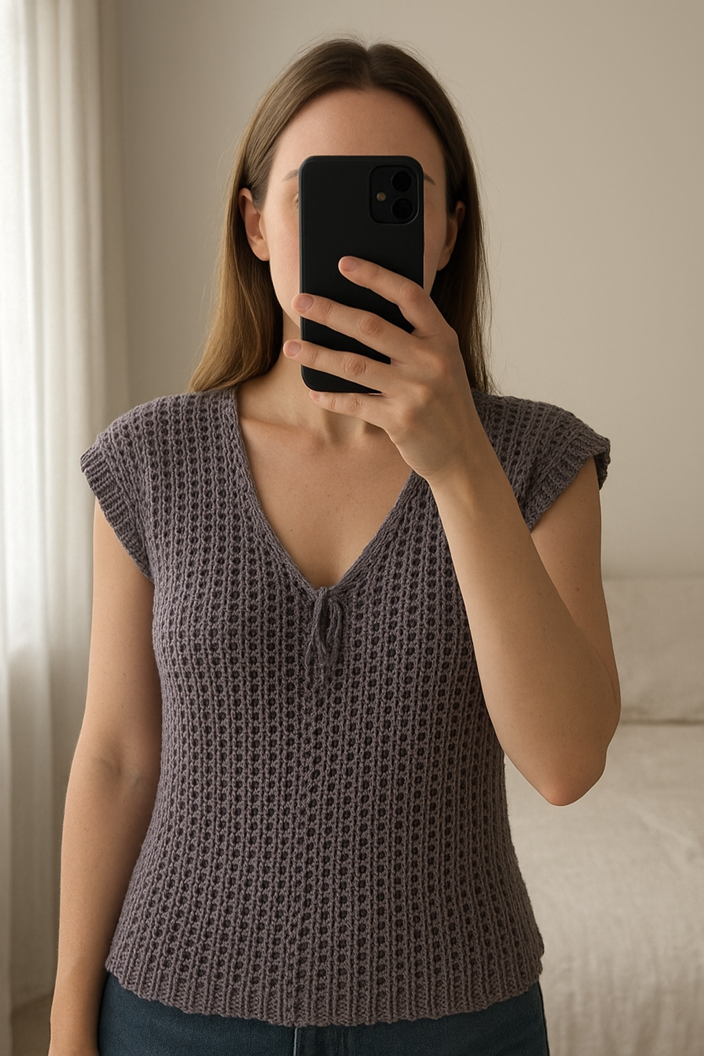 Haut en laine femme multiples debout, face à la caméra, dans une chambre à la lumière douce, avec une lumière naturelle filtrant par la fenêtre.
