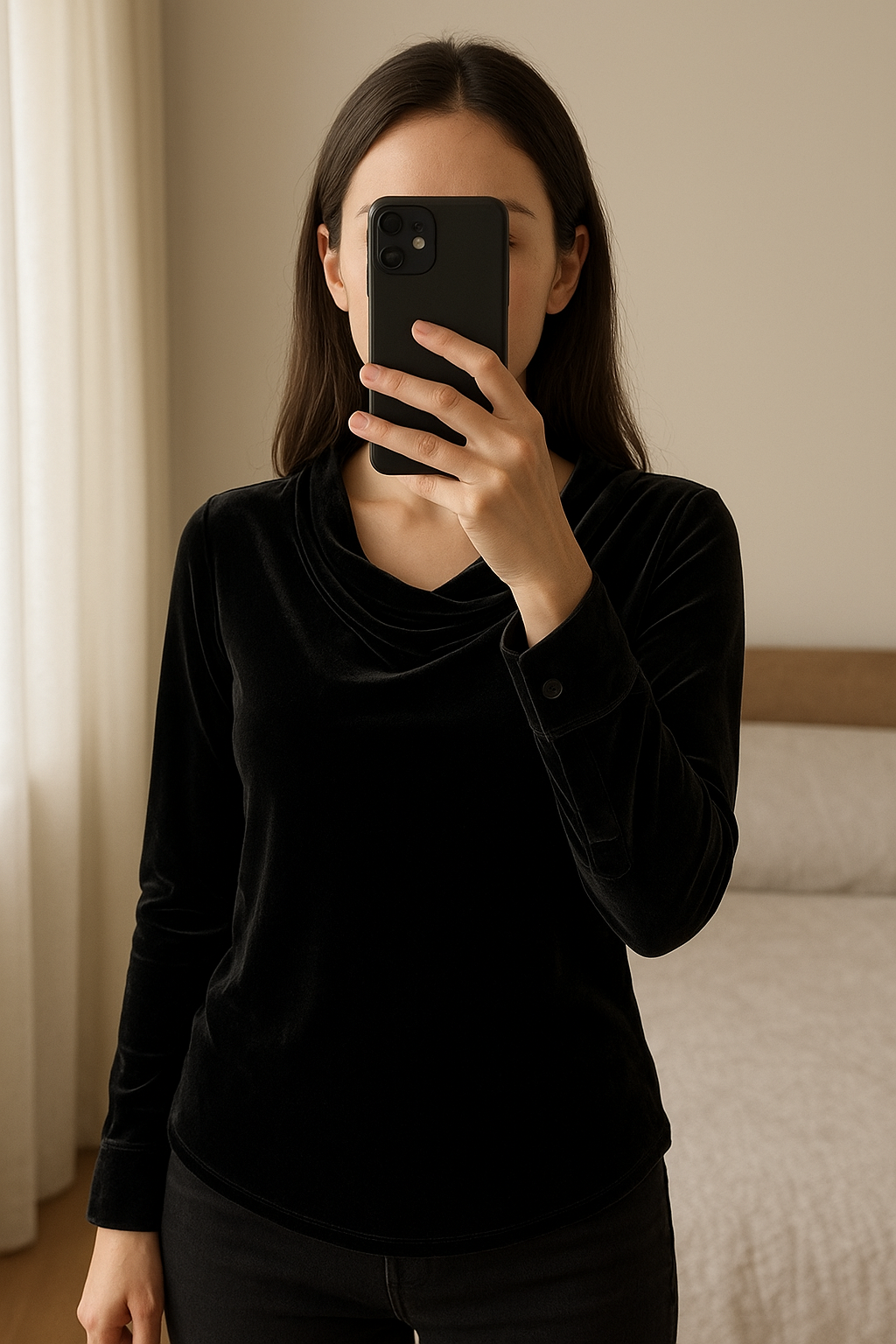 Haut femme noir Ralph Lauren debout, face à la caméra, dans une chambre à la lumière douce, avec une lumière naturelle filtrant par la fenêtre.