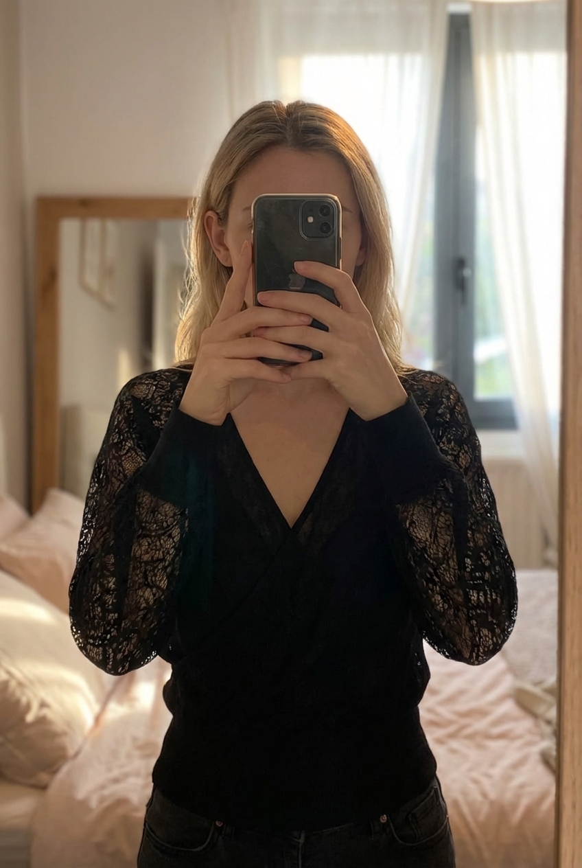 Haut manches dentelles M debout, face à la caméra, dans une chambre à la lumière douce, avec une lumière naturelle filtrant par la fenêtre.