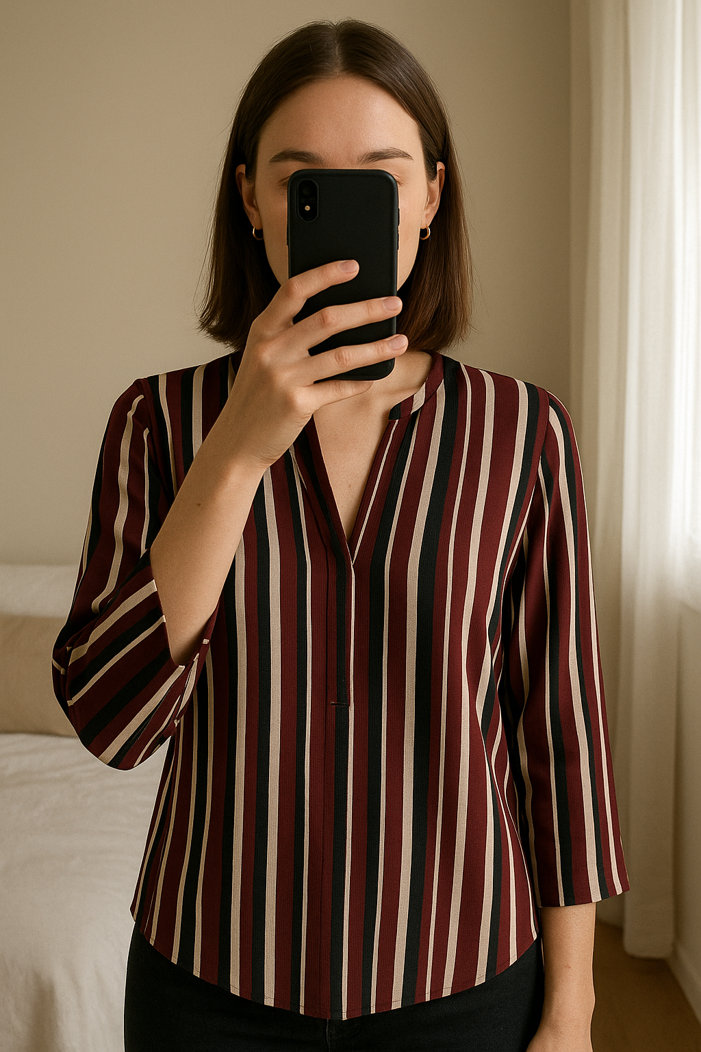 Haut Morgan debout, face à la caméra, dans une chambre à la lumière douce, avec une lumière naturelle filtrant par la fenêtre.