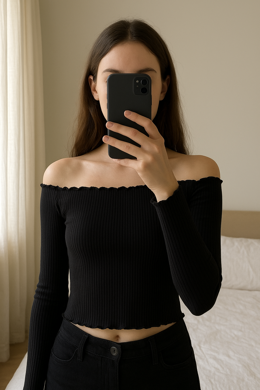 Haut épaules dénudées debout, face à la caméra, dans une chambre à la lumière douce, avec une lumière naturelle filtrant par la fenêtre.