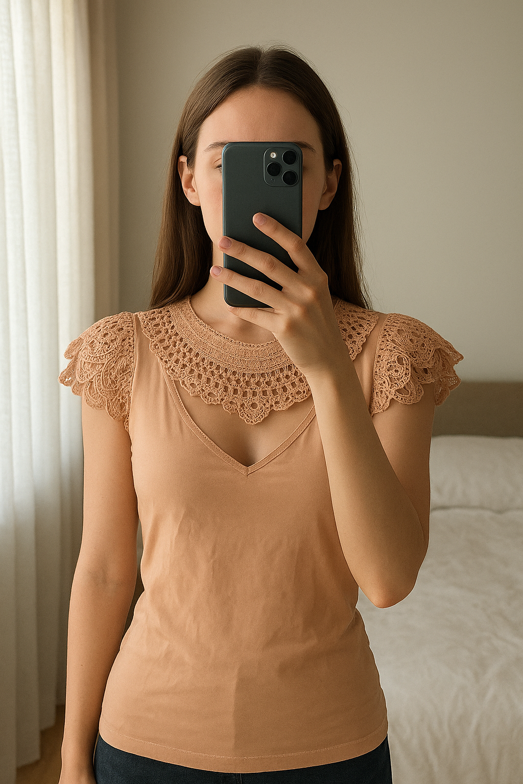 Haut tee-shirts perlés taille s/m debout, face à la caméra, dans une chambre à la lumière douce, avec une lumière naturelle filtrant par la fenêtre.