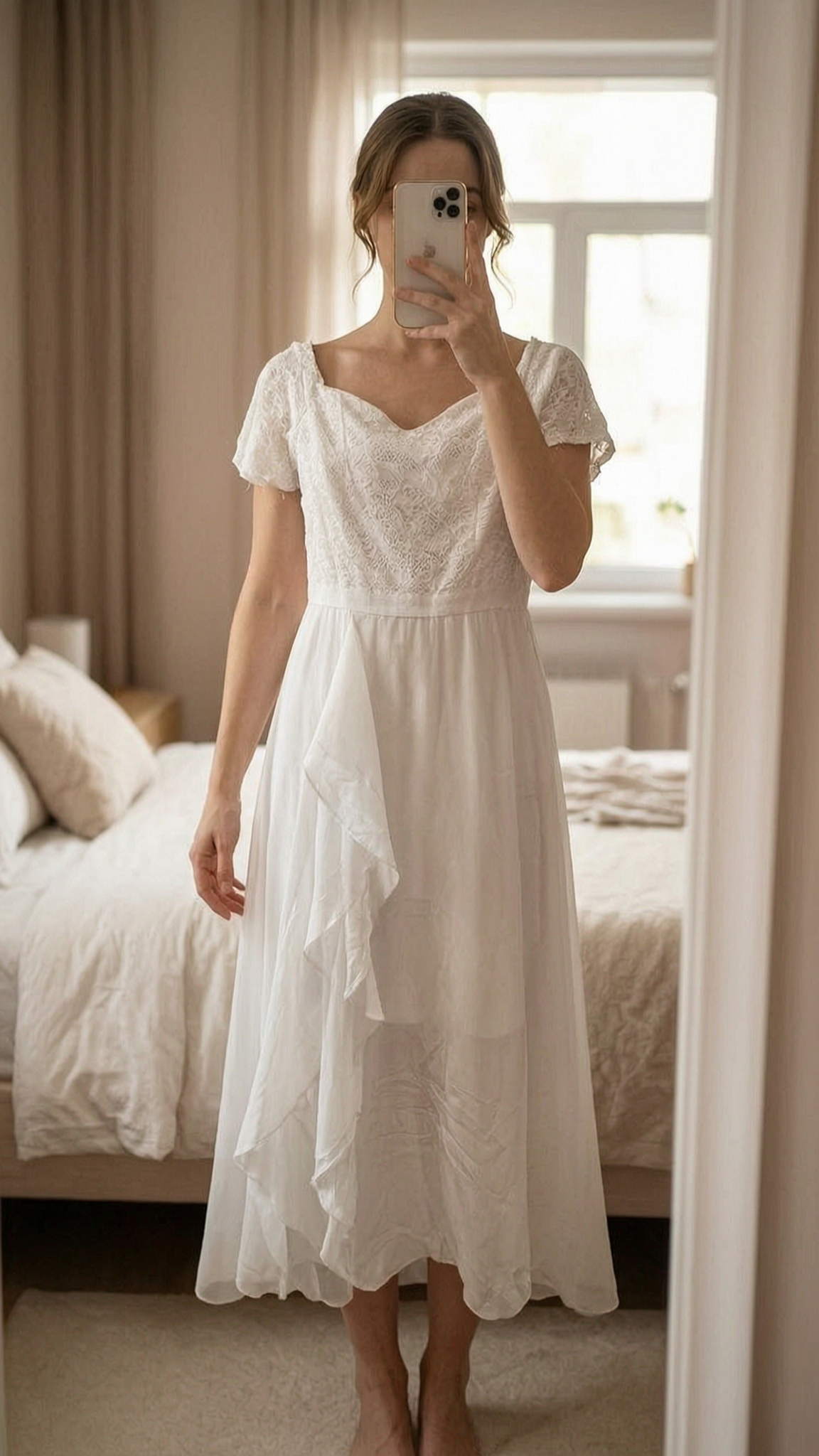 Hochzeitskleid aufrecht stehend, der Kamera zugewandt, in einem sanft beleuchteten Schlafzimmer, mit natürlichem Licht, das durch ein Fenster fällt.