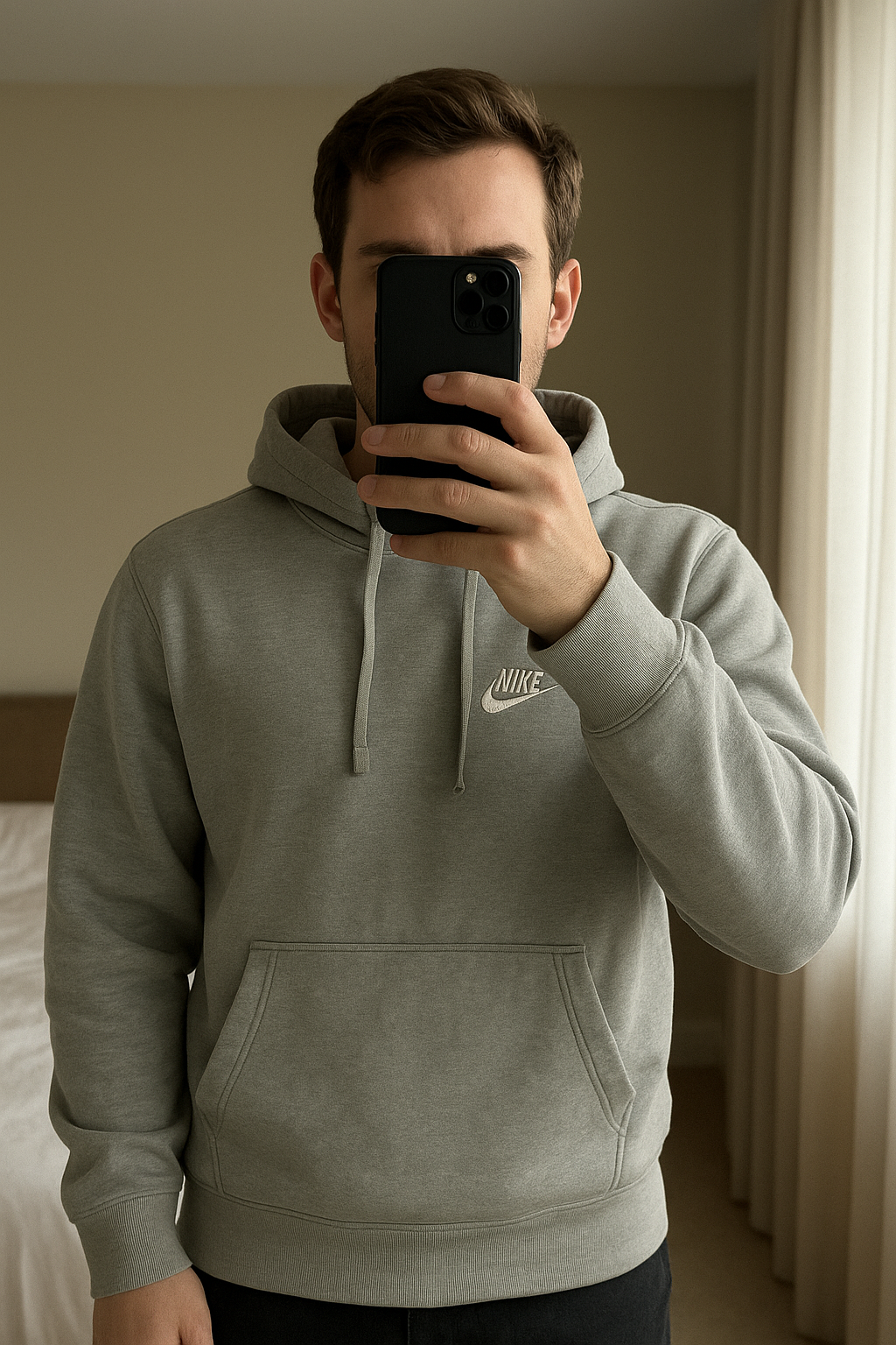 Hoodie Nike Fleece Club debout, face à la caméra, dans une chambre à la lumière douce, avec une lumière naturelle filtrant par la fenêtre.