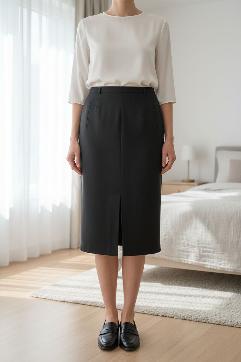Hucke Woman Rock Gr. 46 Schwarz Midirock mit Schlitz & Taschen aufrecht stehend, der Kamera zugewandt, in einem sanft beleuchteten Schlafzimmer, mit natürlichem Licht, das durch ein Fenster fällt.