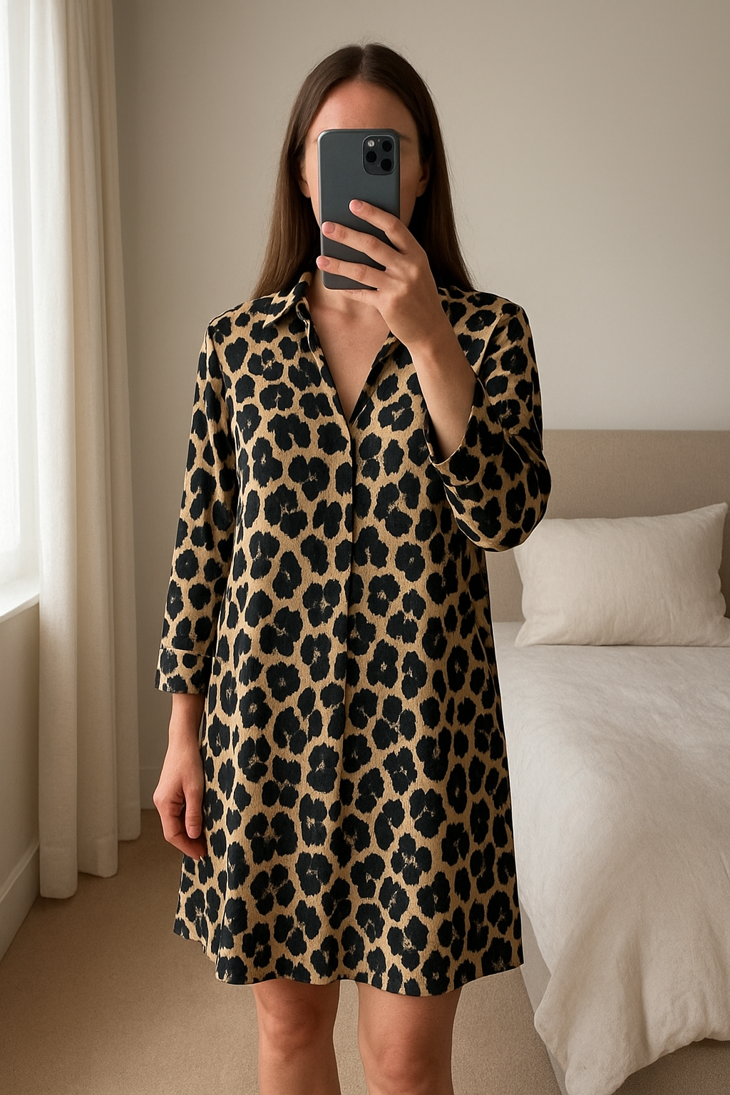 Intemporelle robe chemise léopard Zara debout, face à la caméra, dans une chambre à la lumière douce, avec une lumière naturelle filtrant par la fenêtre.