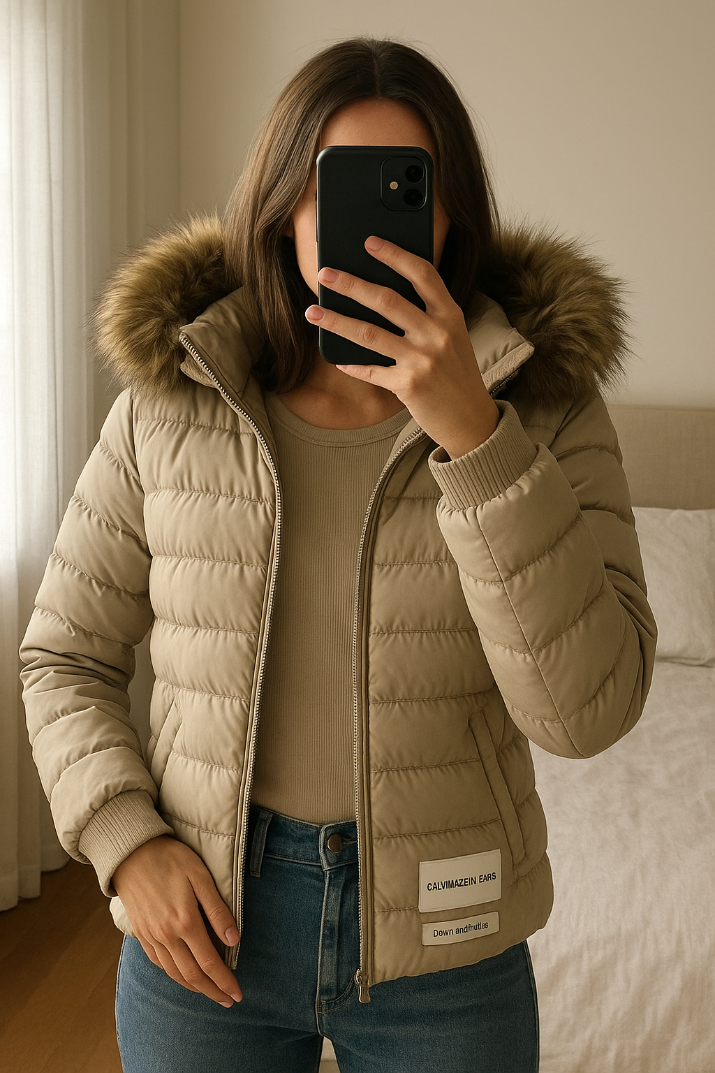 Jacke damen aufrecht stehend, der Kamera zugewandt, in einem sanft beleuchteten Schlafzimmer, mit natürlichem Licht, das durch ein Fenster fällt.