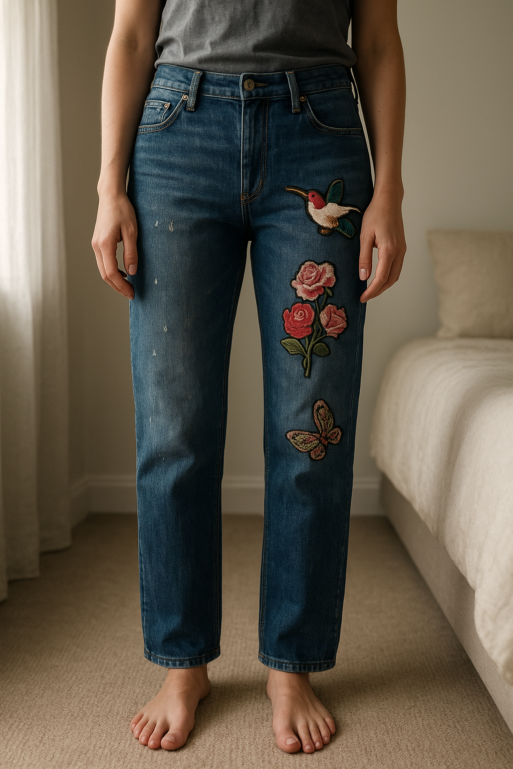 Jean broderie debout, face à la caméra, dans une chambre à la lumière douce, avec une lumière naturelle filtrant par la fenêtre.