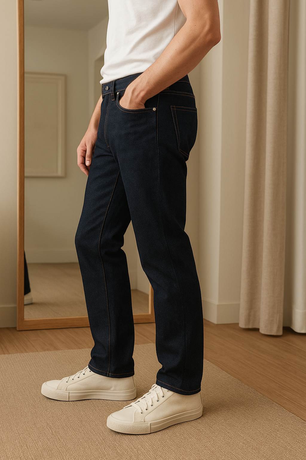 Une personne en jean brut h&m cambrant légèrement le dos pour une pose dynamique, dans une cabine d’essayage de style boutique avec un miroir et une décoration neutre.