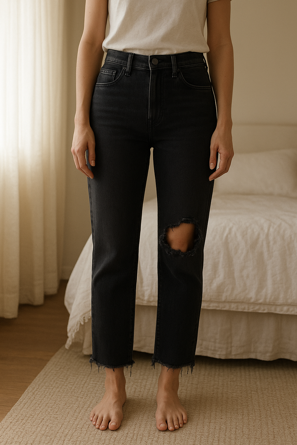 Jean court debout, face à la caméra, dans une chambre à la lumière douce, avec une lumière naturelle filtrant par la fenêtre.