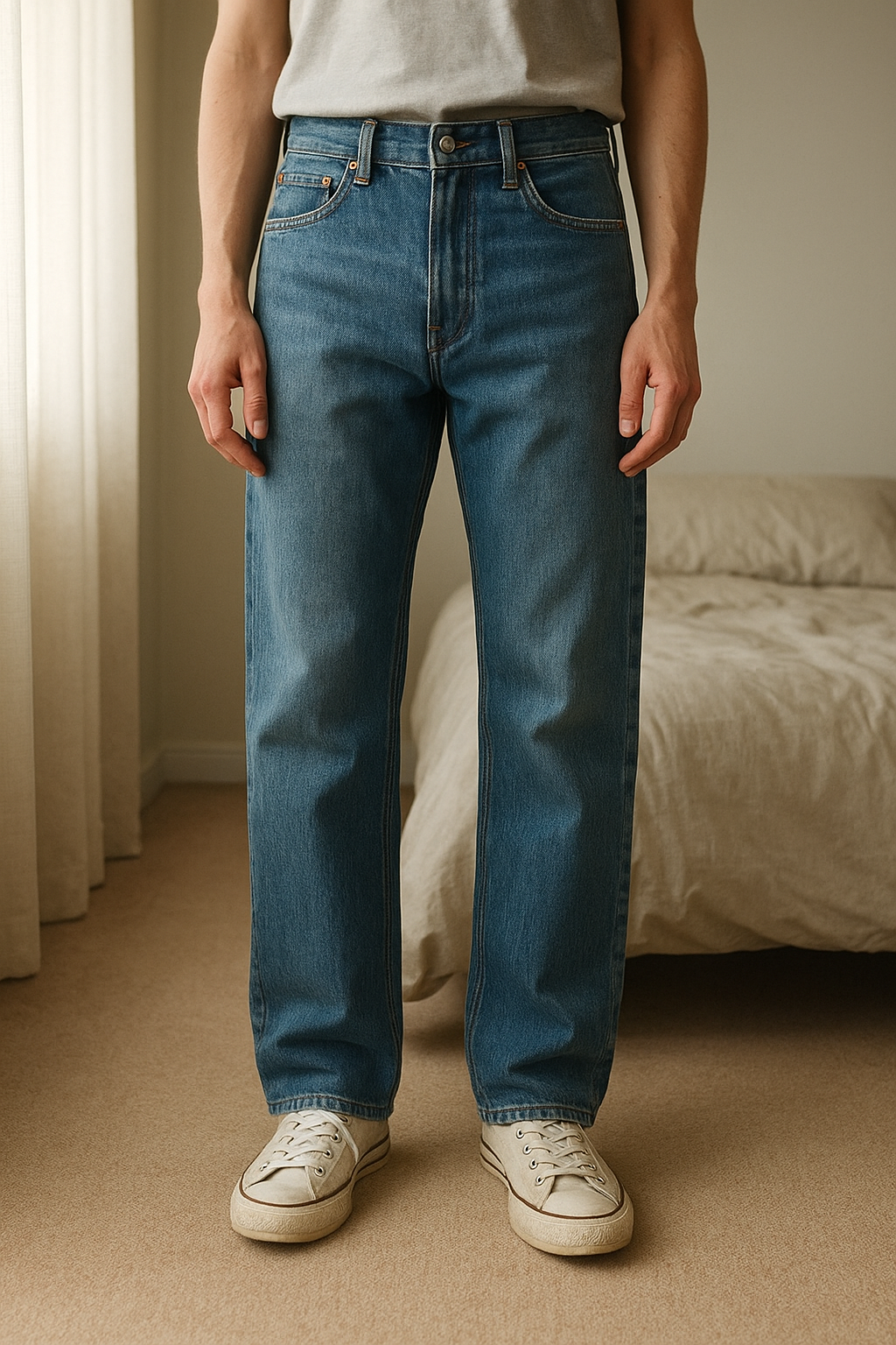 Jean Droit de pie, mirando a la cámara, en un dormitorio con luz suave y natural filtrándose por la ventana.