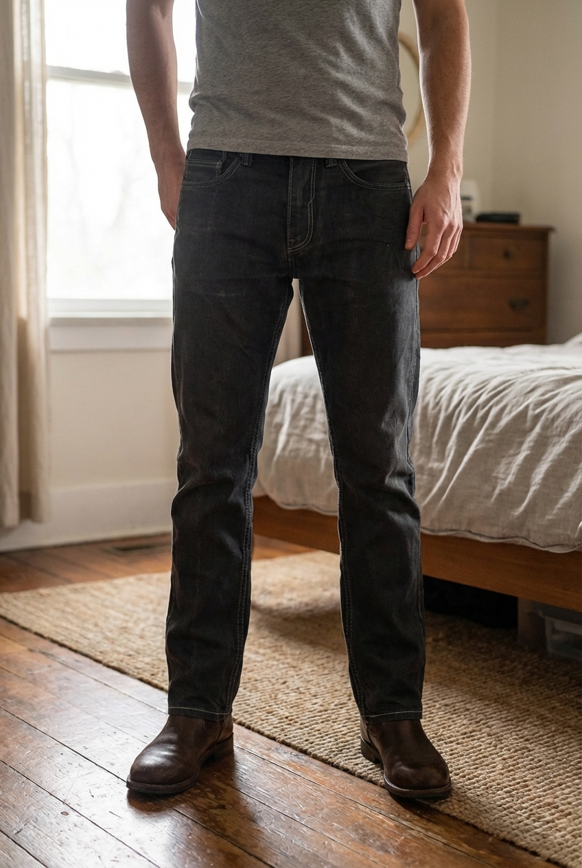 Jean levi’s 527 taille W32L32 debout, face à la caméra, dans une chambre à la lumière douce, avec une lumière naturelle filtrant par la fenêtre.
